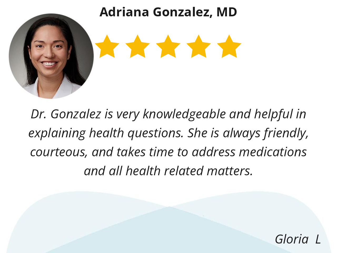 Dr. Gonzalez is very knowledgeable and helpful in explaining health questions. She is always friendly, courteous, and takes time to address medications and all health related matters.