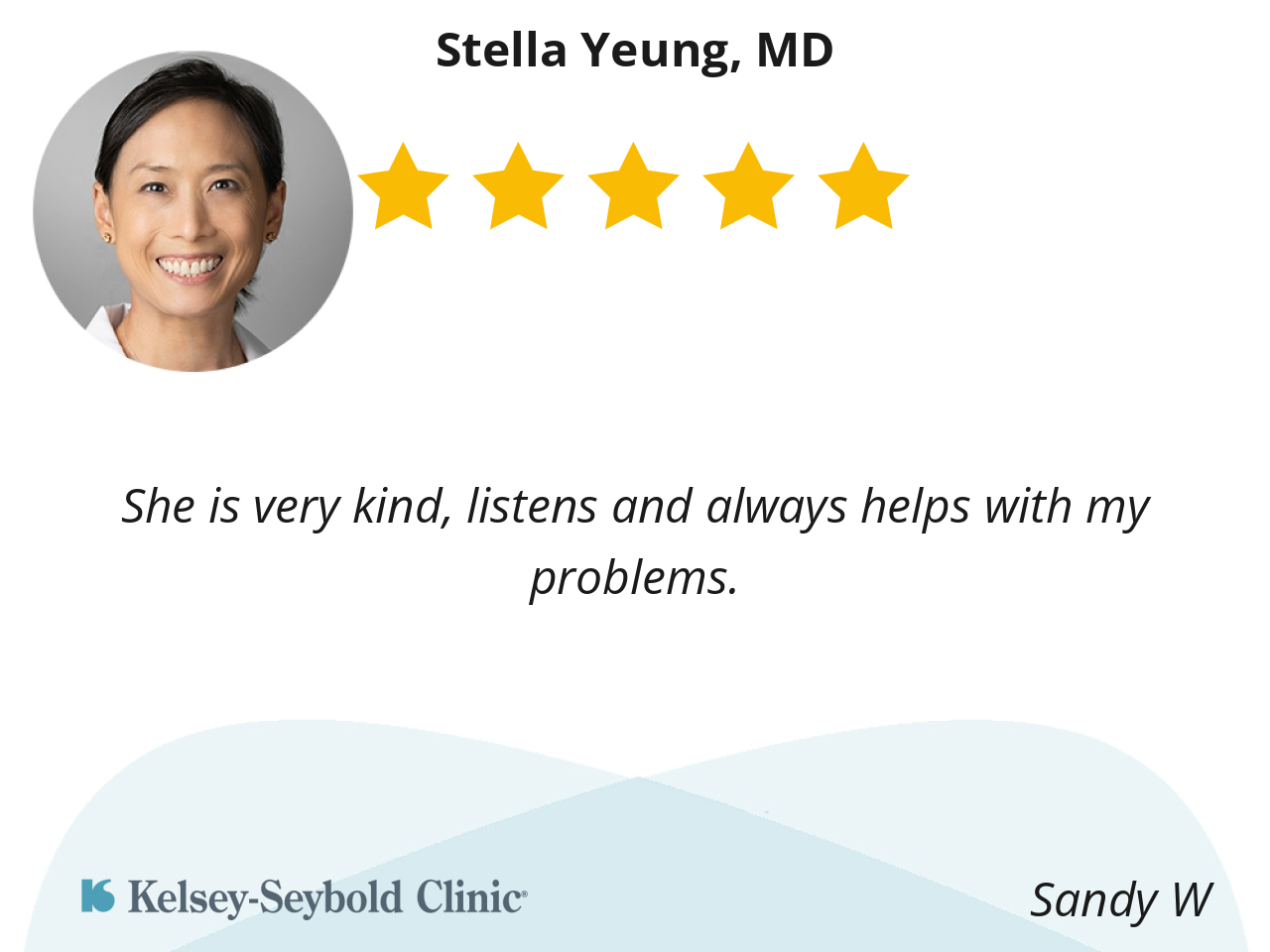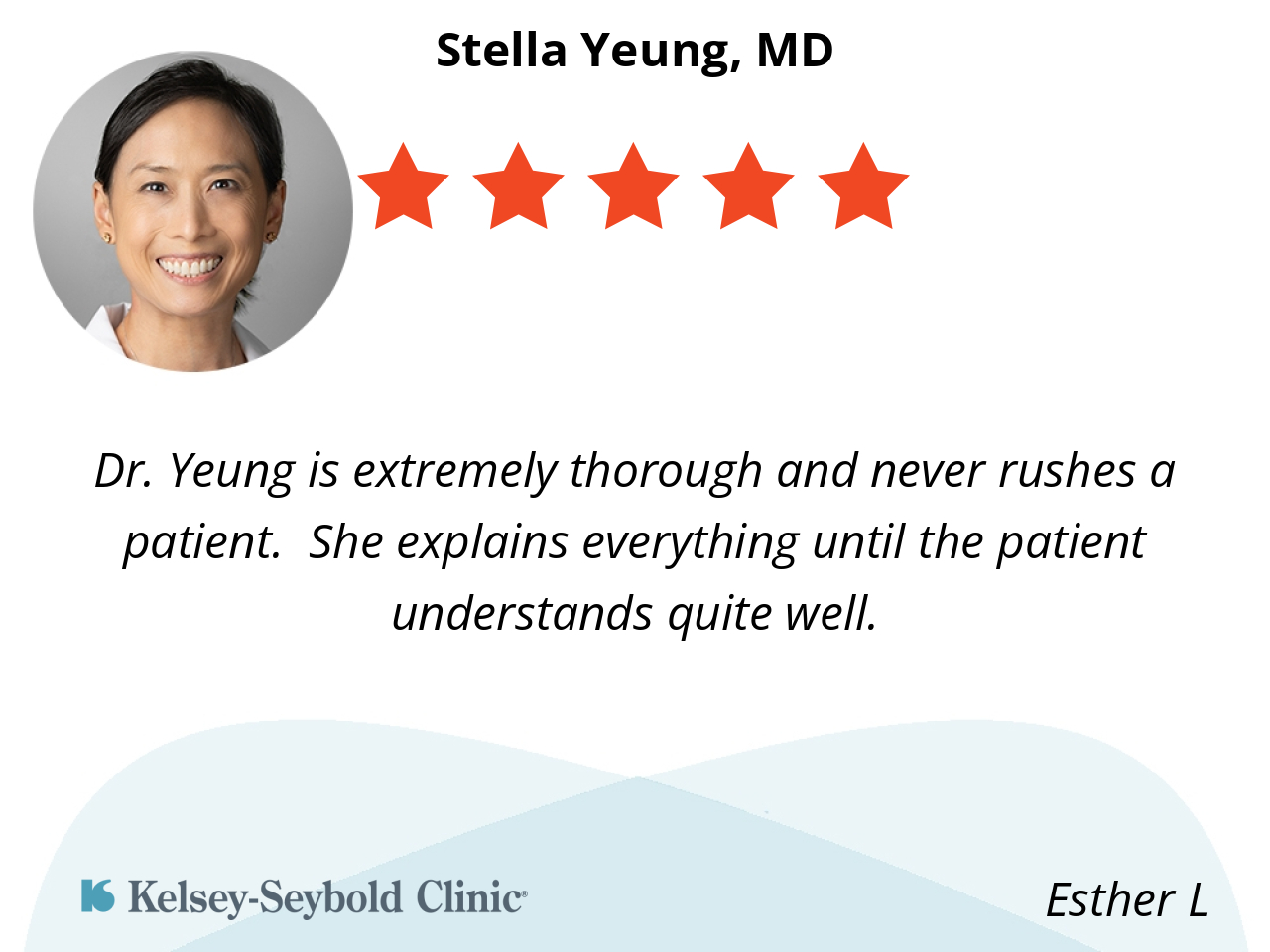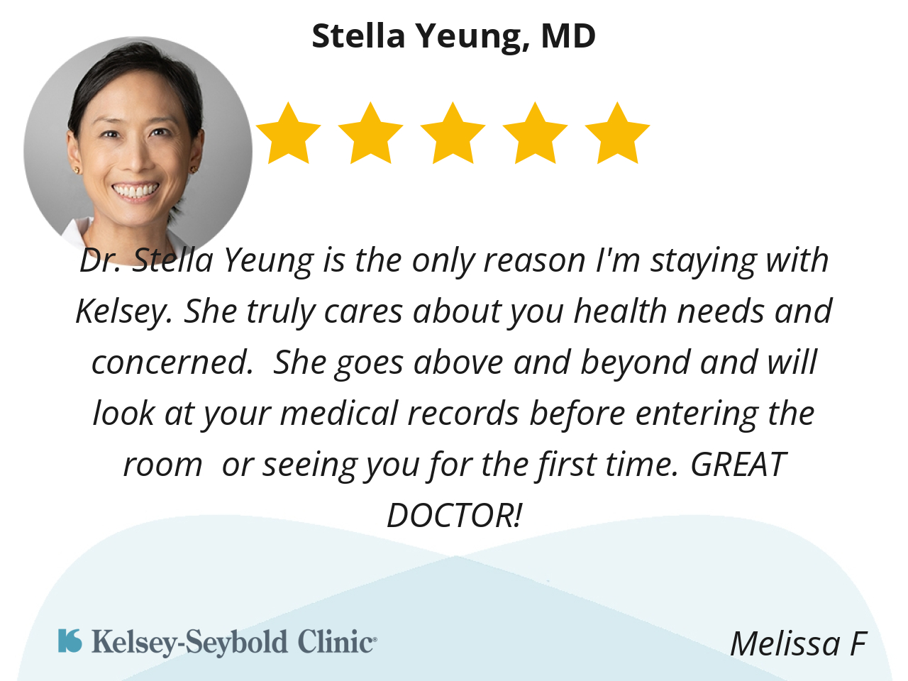 Dr. Stella Yeung is the only reason I'm staying with Kelsey. She truly cares about you health needs and concerned. She goes above and beyond and will look at your medical records before entering the room or seeing you for the first time. GREAT DOCTOR!