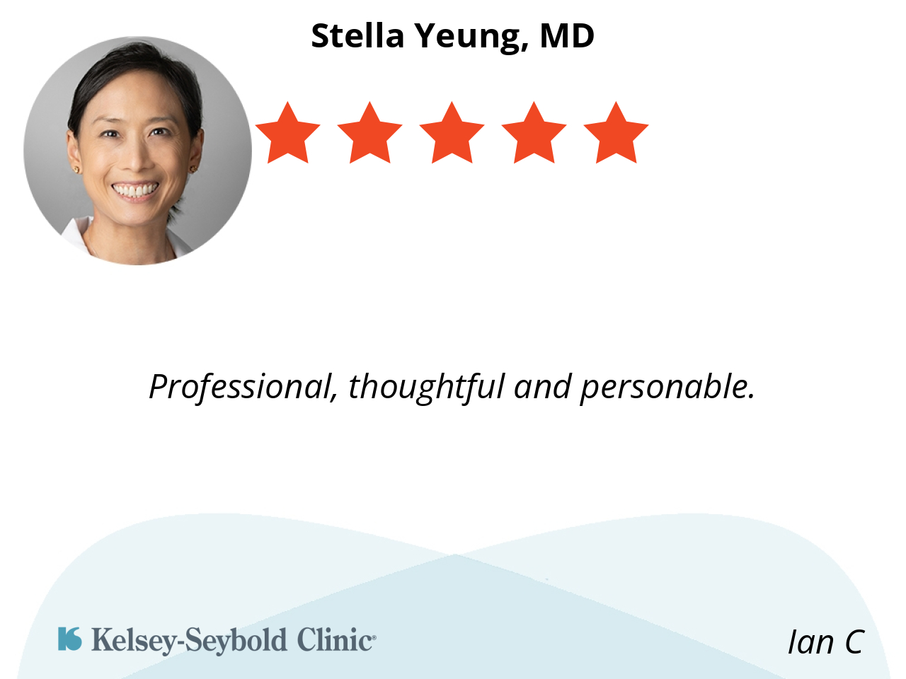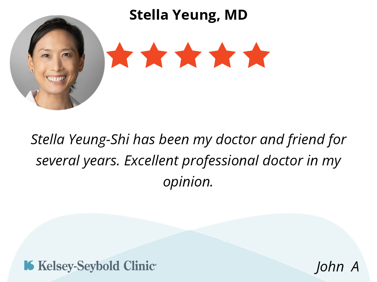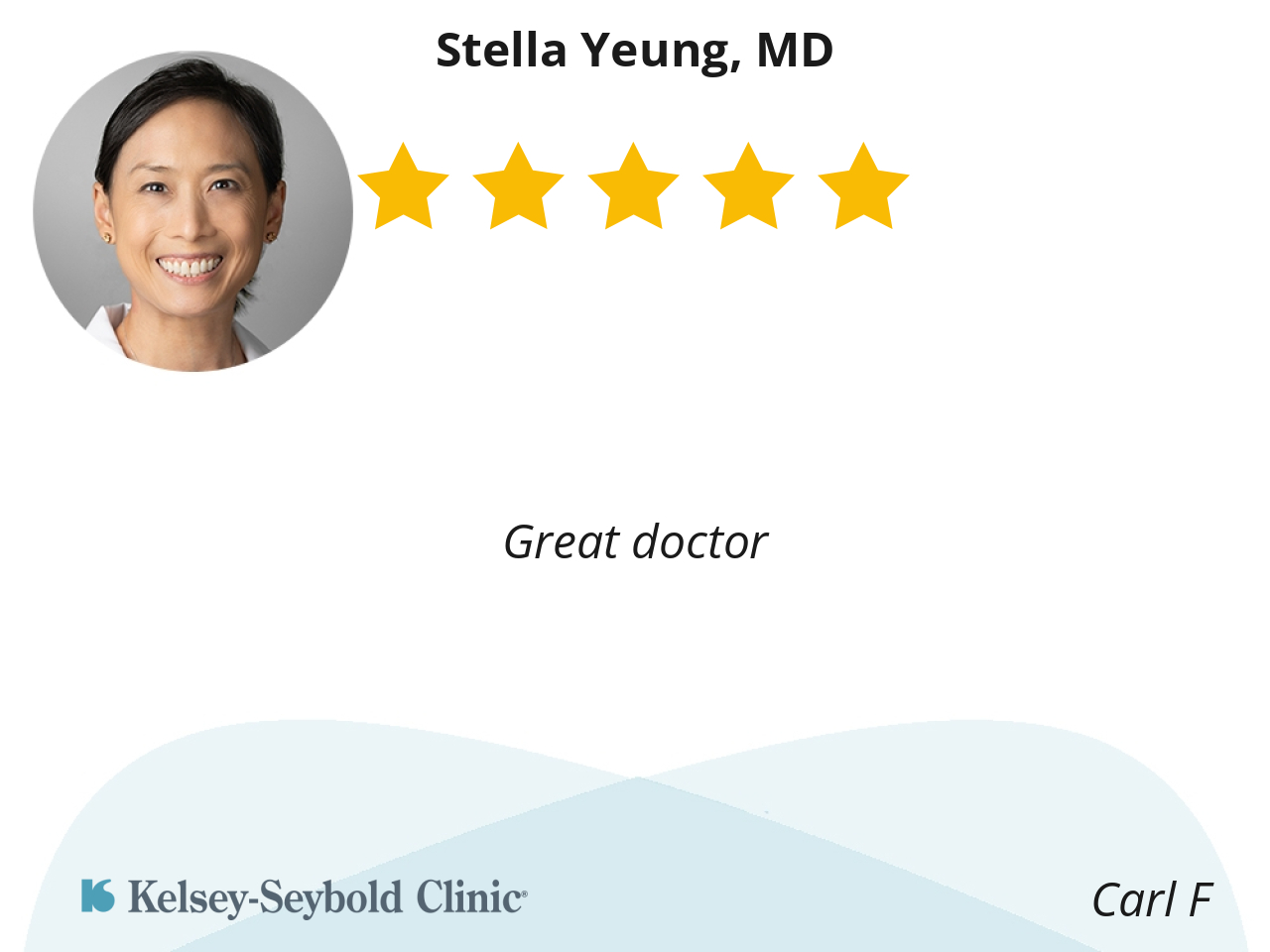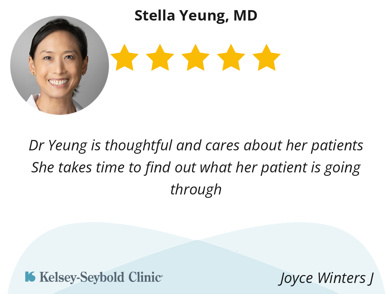 Dr. Stella Yeung is the only reason I'm staying with Kelsey. She truly cares about you health needs and concerned. She goes above and beyond and will look at your medical records before entering the room or seeing you for the first time. GREAT DOCTOR!