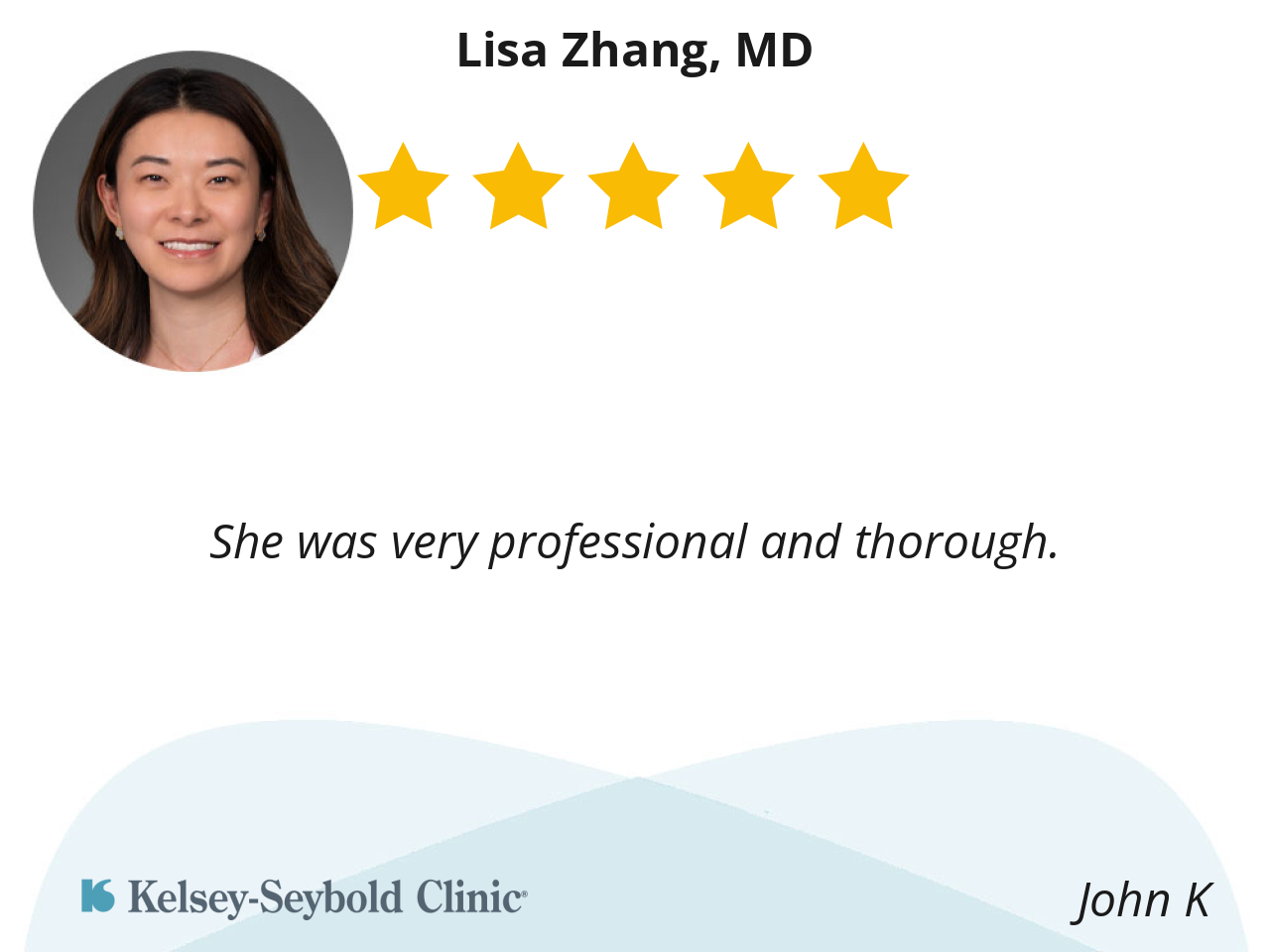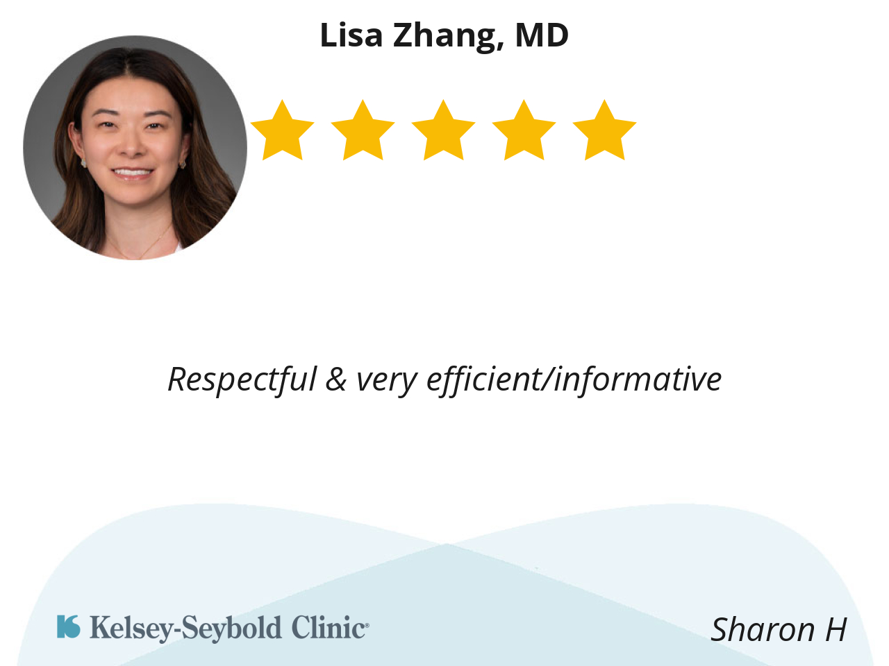 Dr. Lisa Zhang is attentive, compassionate, and professional. I appreciate the clear answers and the excellent care that I had received from Dr.Zhang.