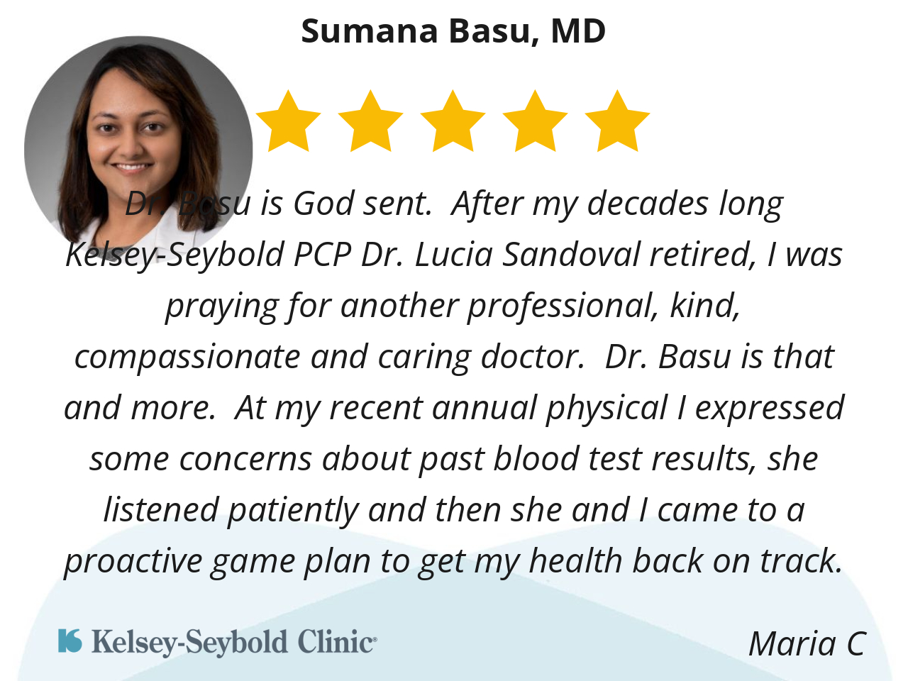 Dr. Basu is God sent. After my decades long Kelsey-Seybold PCP Dr. Lucia Sandoval retired, I was praying for another professional, kind, compassionate and caring doctor. Dr. Basu is that and more. At my recent annual physical I expressed some concerns about past blood test results, she listened patiently and then she and I came to a proactive game plan to get my health back on track.
