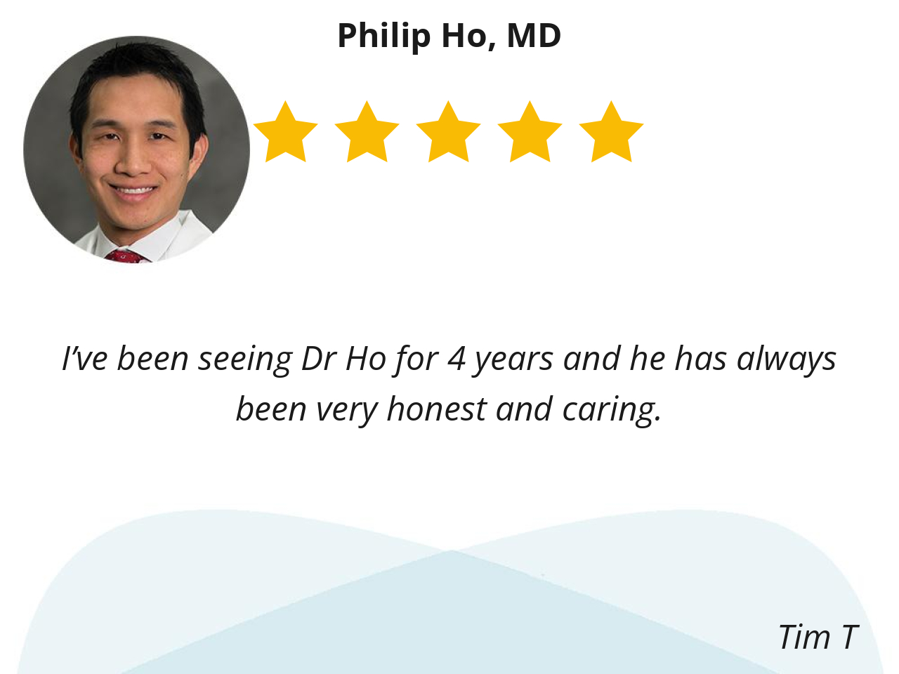 Dr. Ho is excellent. He is caring, he listens and over the years has taken great care of me. I can always ask him a question. Thank you.
