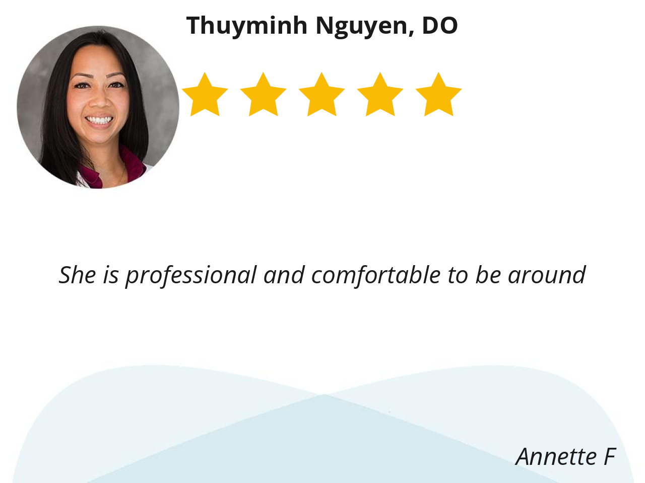 “Dr. Nguyen provided excellent care, explained everything clearly, and treated me with genuine concern and respect. I really appreciate her support