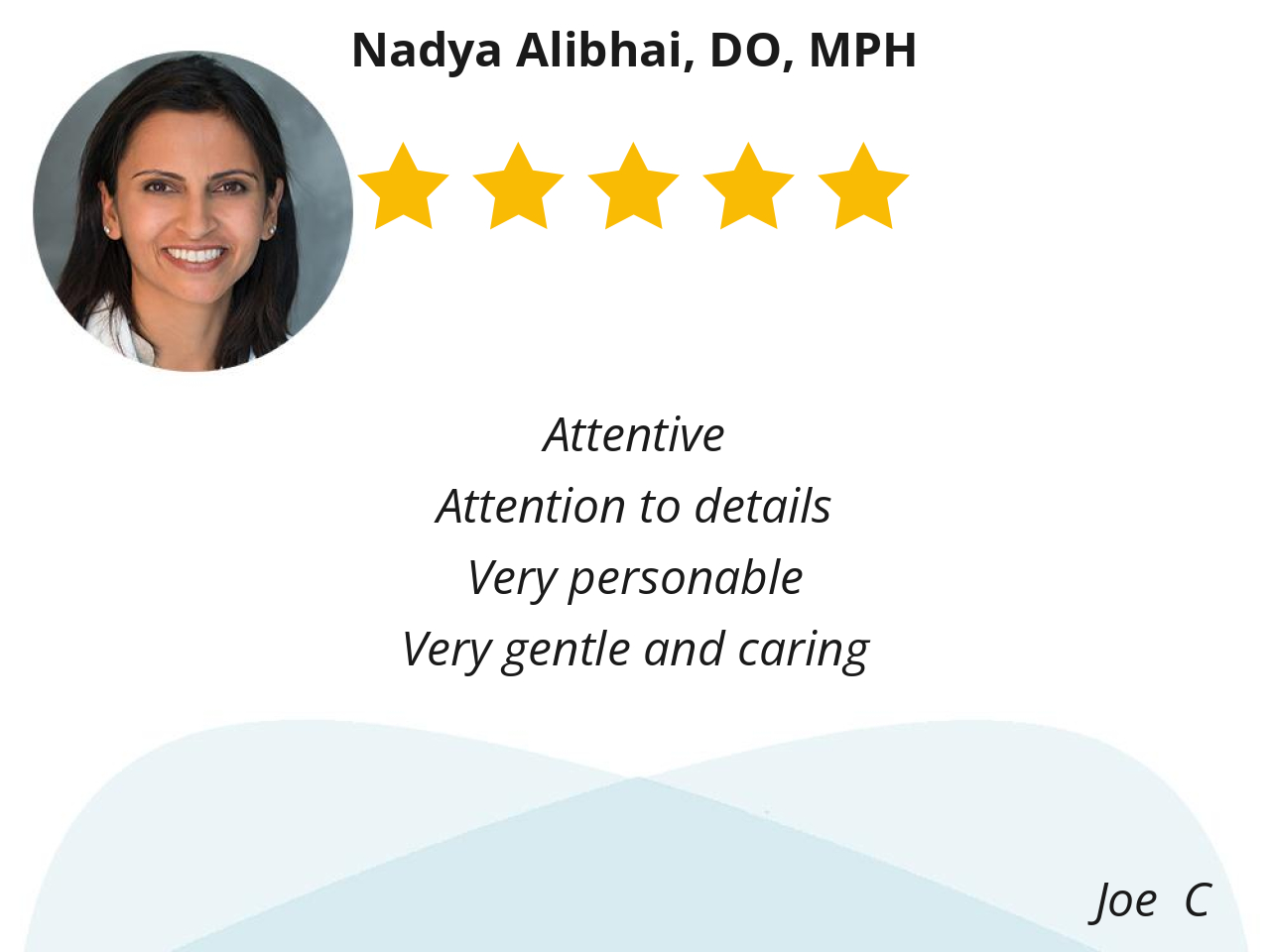 Dr. Alibhai is always kind. Dr. Alibhai listens attentively and with compassion. Dr. Alibhai is very thorough and proactive with my healthcare. I am always reassured that my health is in safe hands with Dr. Alibhai. I always feel more confident that whatever my health challenges might be they are being appropriately addressed by Dr. Alibhai.