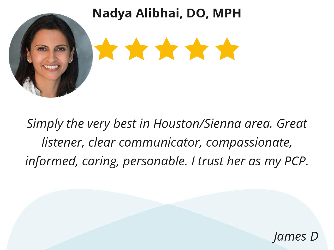 Simply the very best in Houston/Sienna area. Great listener, clear communicator, compassionate, informed, caring, personable. I trust her as my PCP.