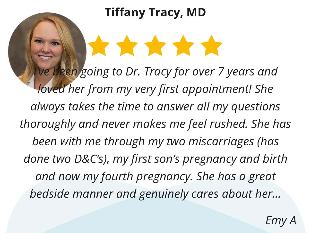 I’ve been going to Dr. Tracy for over 7 years and loved her from my very first appointment! She always takes the time to answer all my questions thoroughly and never makes me feel rushed. She has been with me through my two miscarriages (has done two D&C’s), my first son’s pregnancy and birth and now my fourth pregnancy. She has a great bedside manner and genuinely cares about her patients. You can tell she’s passionate about what she does and truly wants the best for each person she sees. She always gives me peace of mind when I am anxious about something and talks through my options/solutions to my concerns.