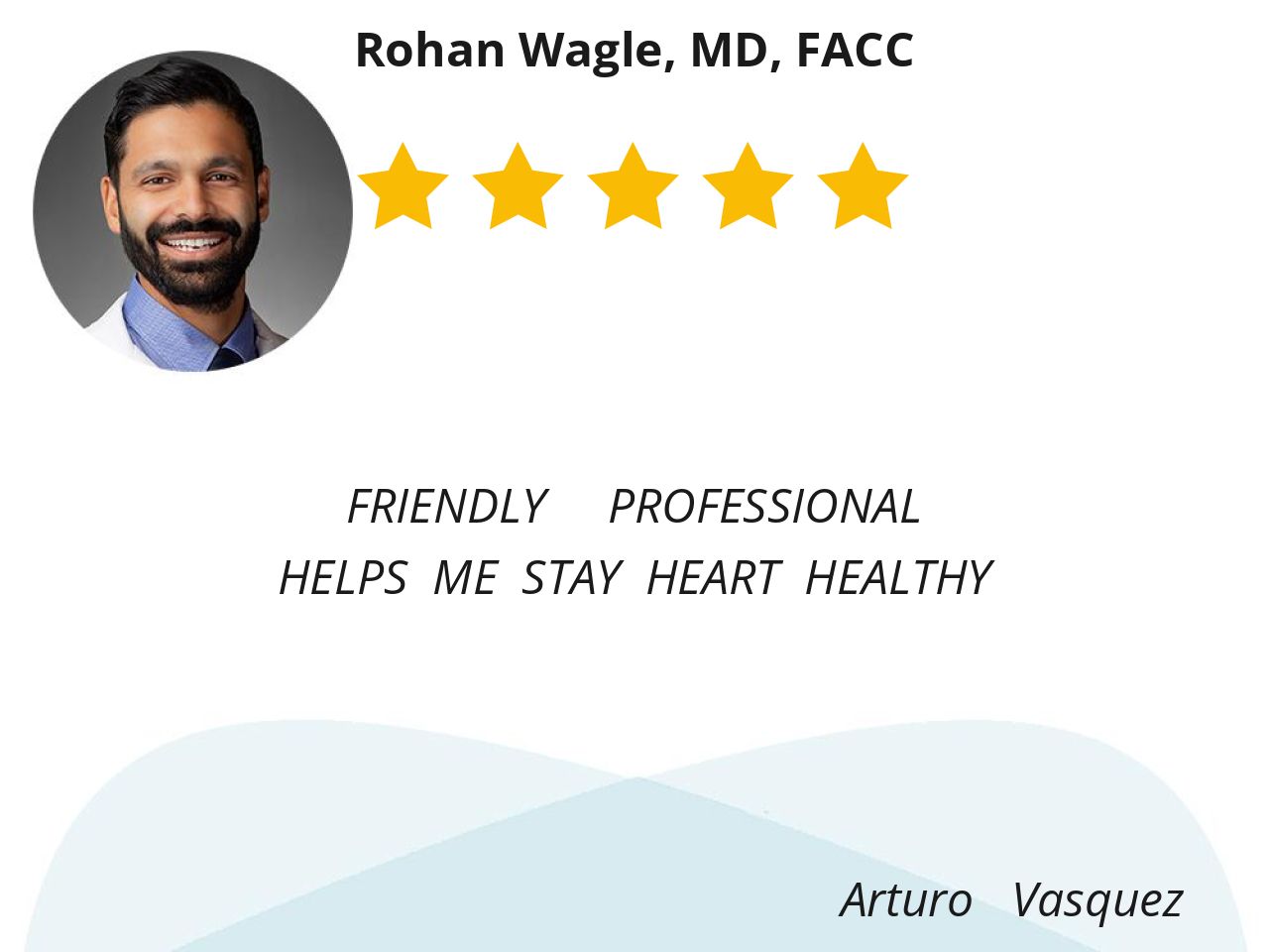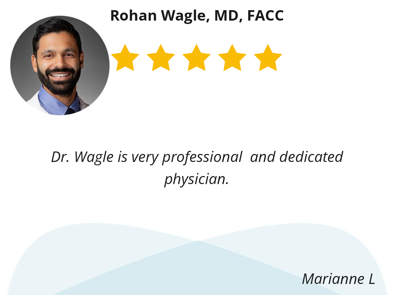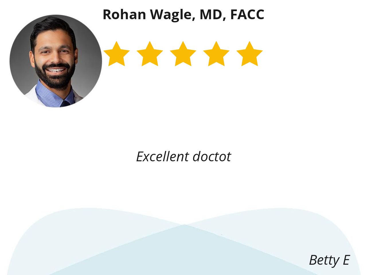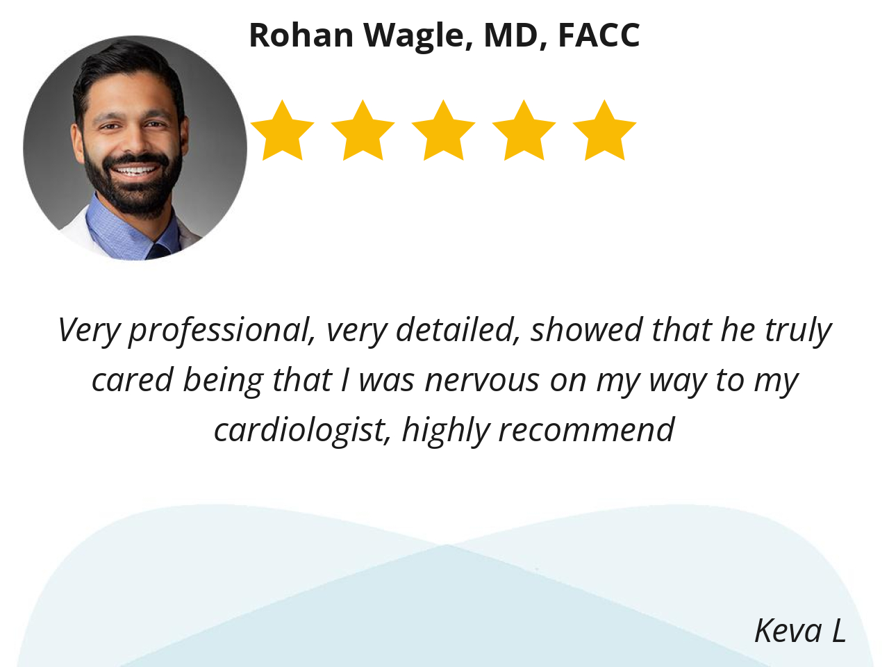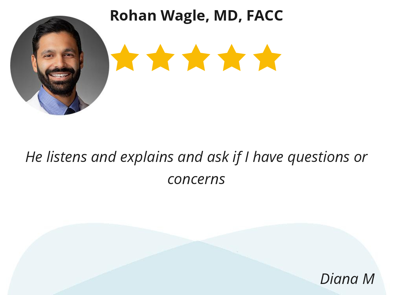 Dr. Wagle has been my cardiologist for several years now. He greets me very warmly when he enters the exam room, and remains friendly and unrushed throughout the appointment. He always comes across as sincerely interested in my well being.
