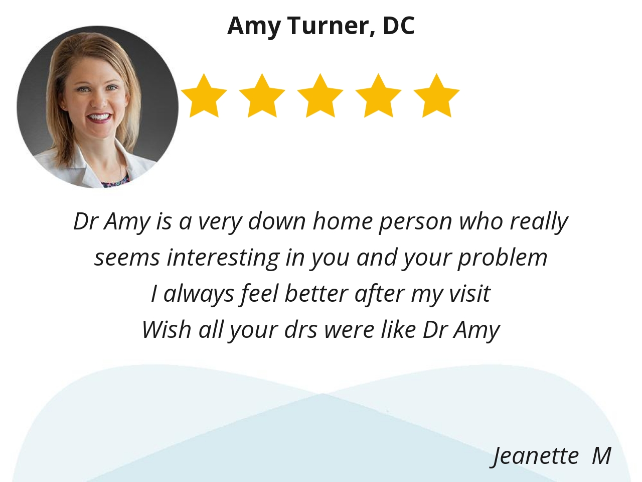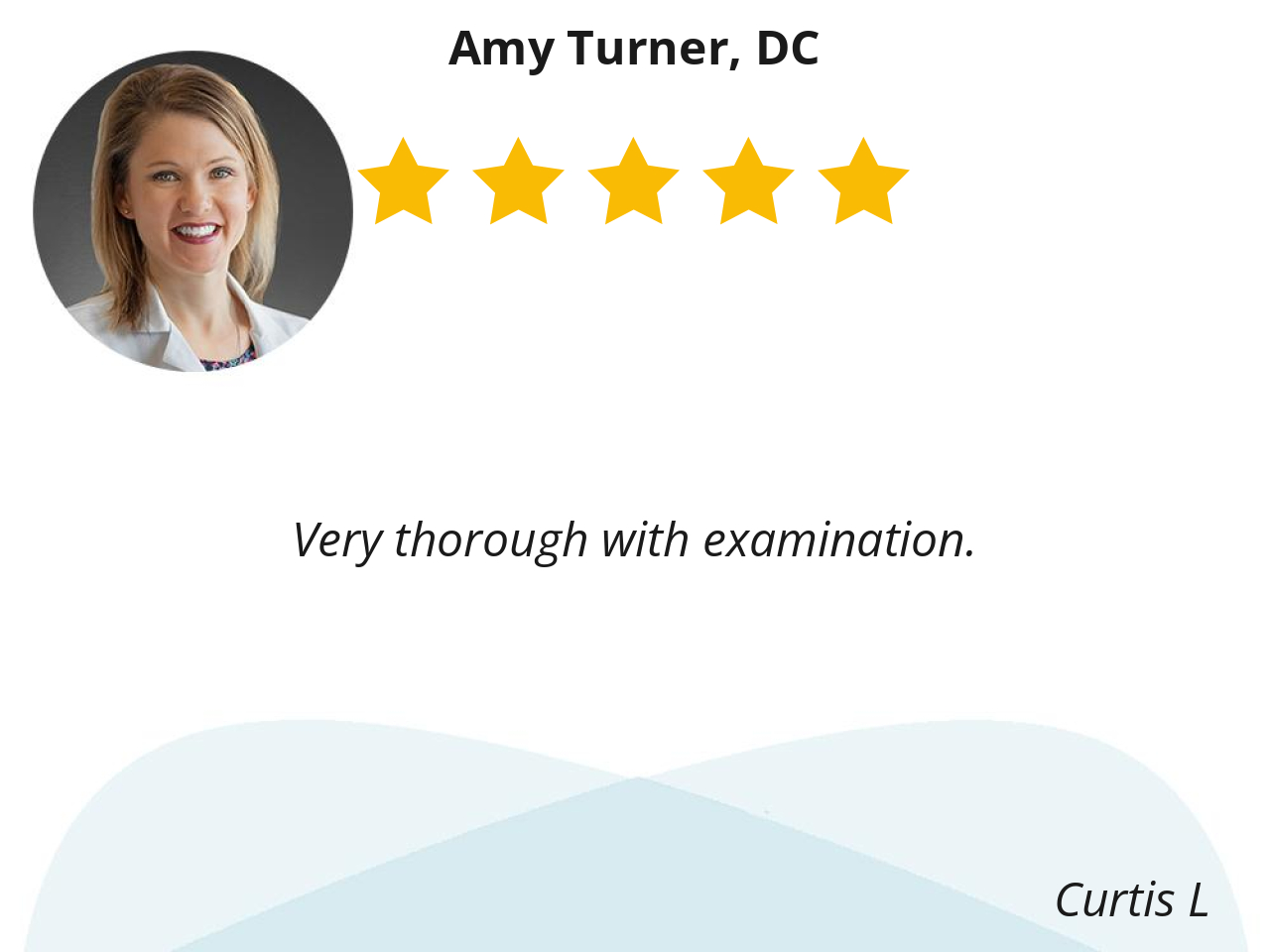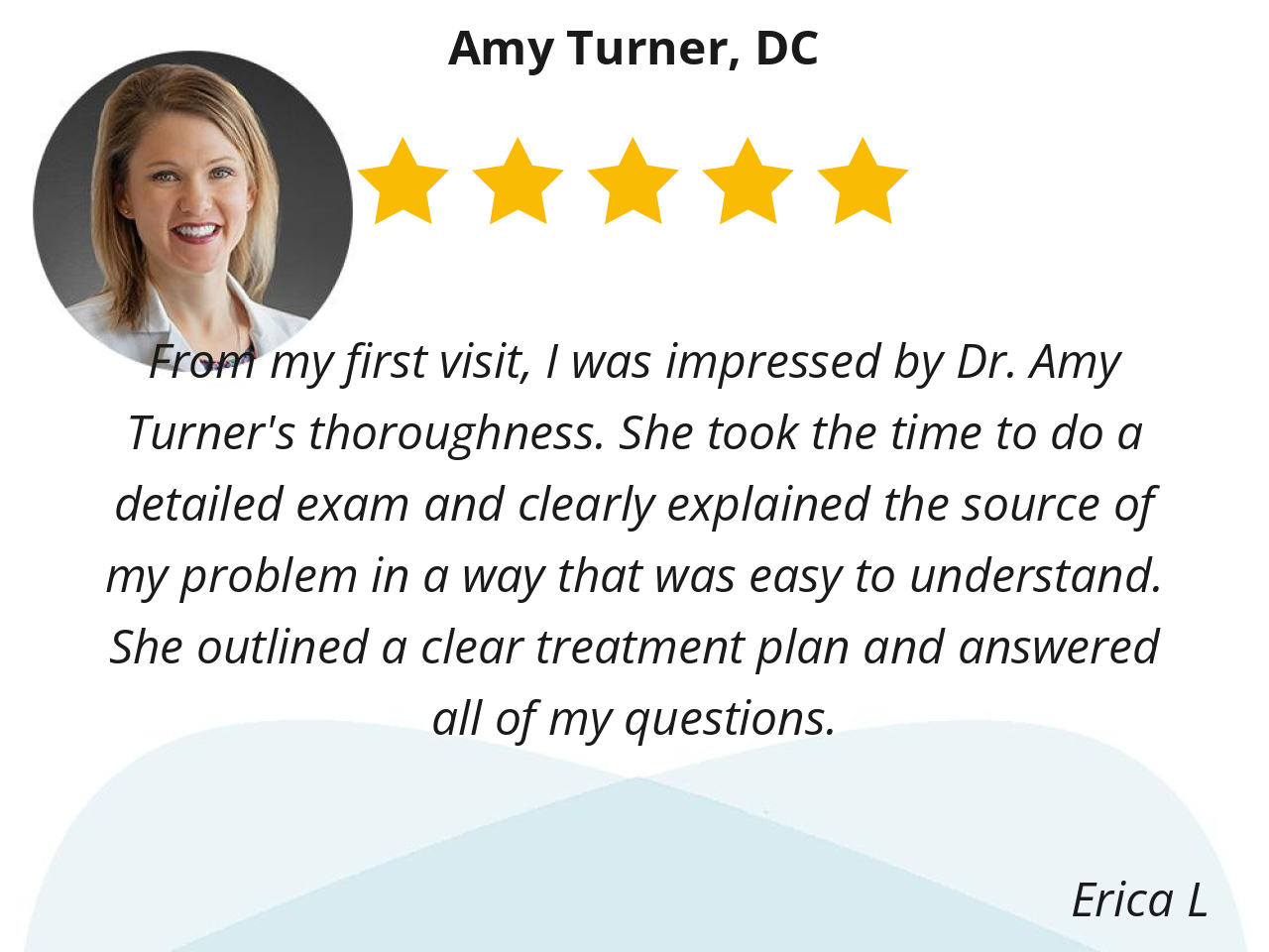 From my first visit, I was impressed by Dr. Amy Turner's thoroughness. She took the time to do a detailed exam and clearly explained the source of my problem in a way that was easy to understand. She outlined a clear treatment plan and answered all of my questions.