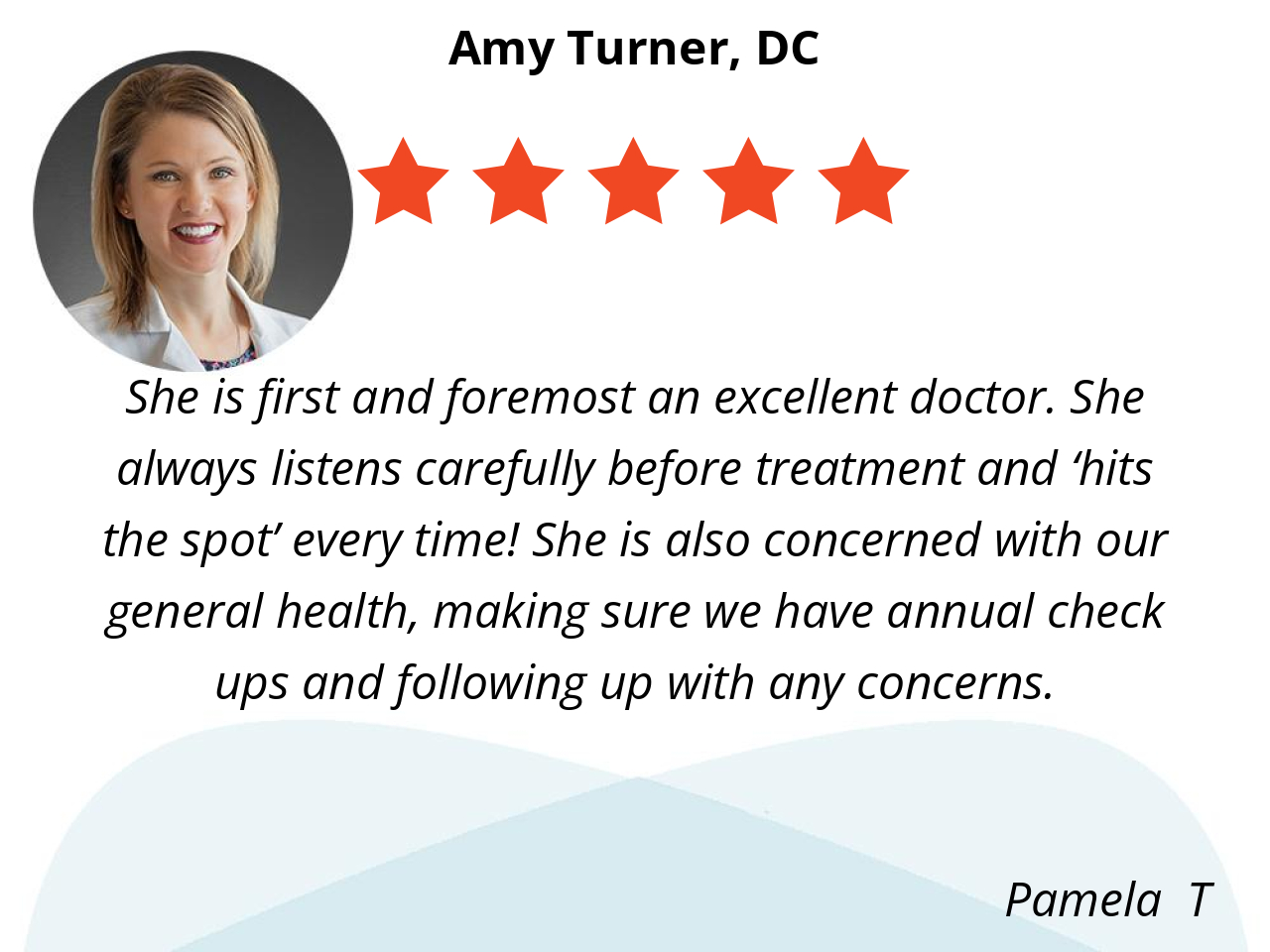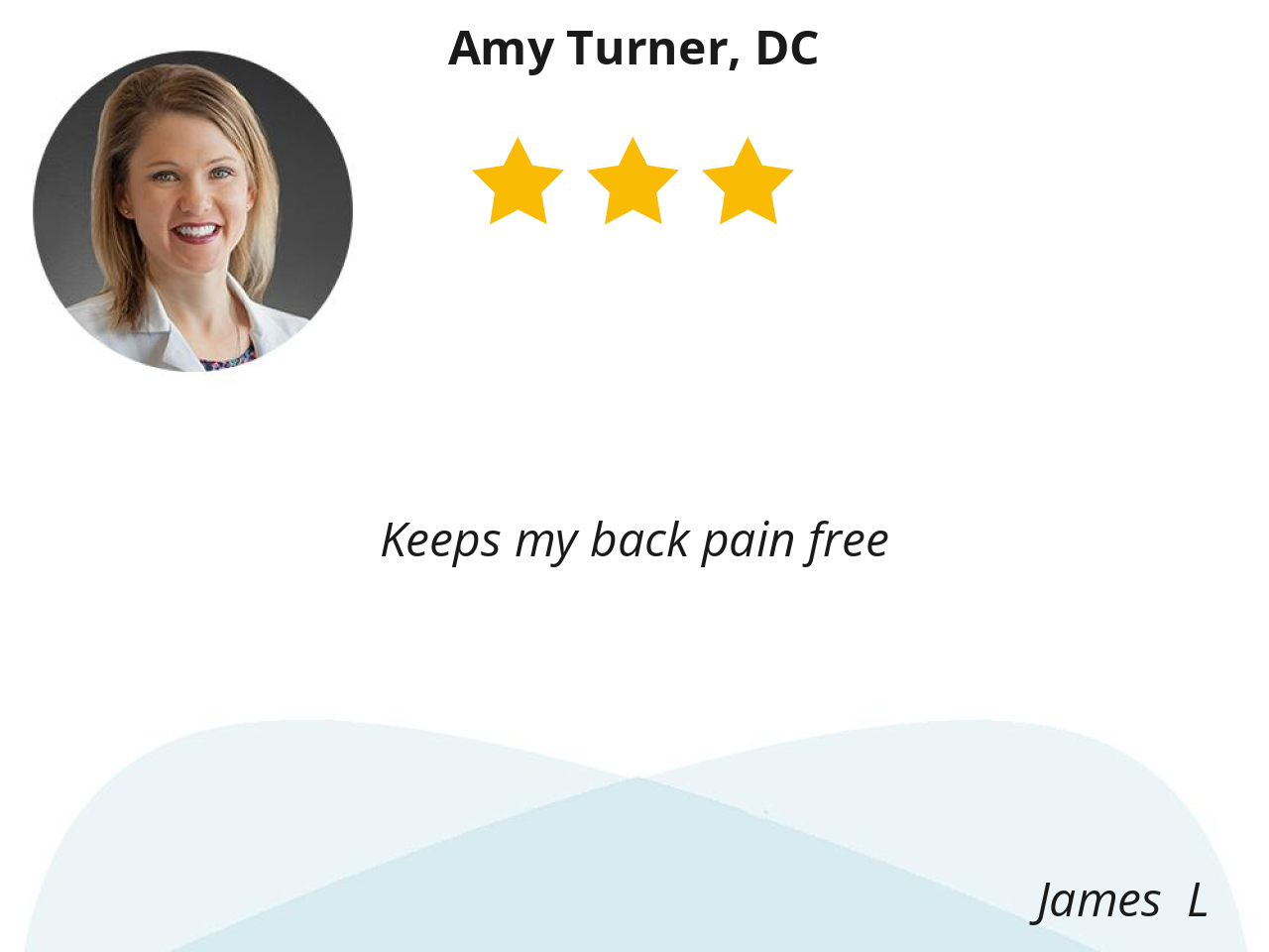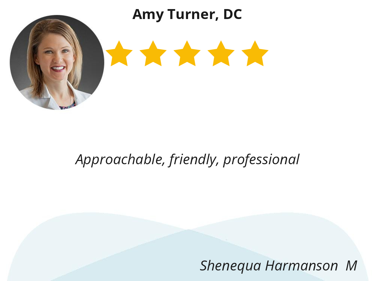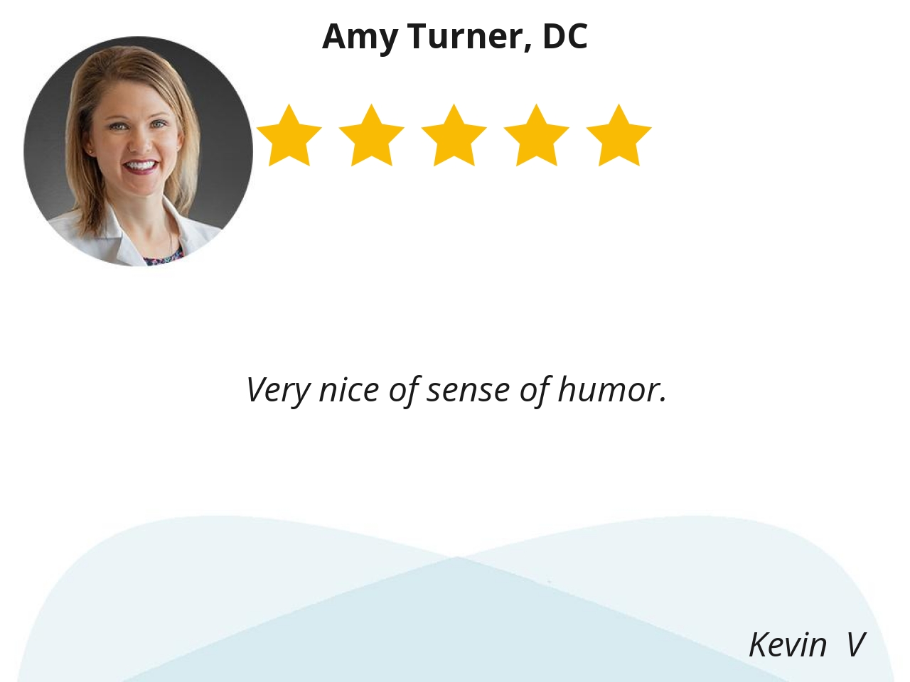 From my first visit, I was impressed by Dr. Amy Turner's thoroughness. She took the time to do a detailed exam and clearly explained the source of my problem in a way that was easy to understand. She outlined a clear treatment plan and answered all of my questions.