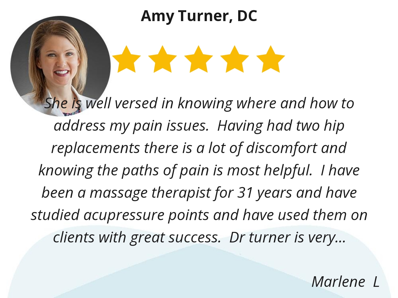 She is well versed in knowing where and how to address my pain issues. Having had two hip replacements there is a lot of discomfort and knowing the paths of pain is most helpful. I have been a massage therapist for 31 years and have studied acupressure points and have used them on clients with great success. Dr turner is very knowledgeable in the area of pain management and adds tremendously to bringing healing in the health issues. Much needed vs pills as a band aid to only cover