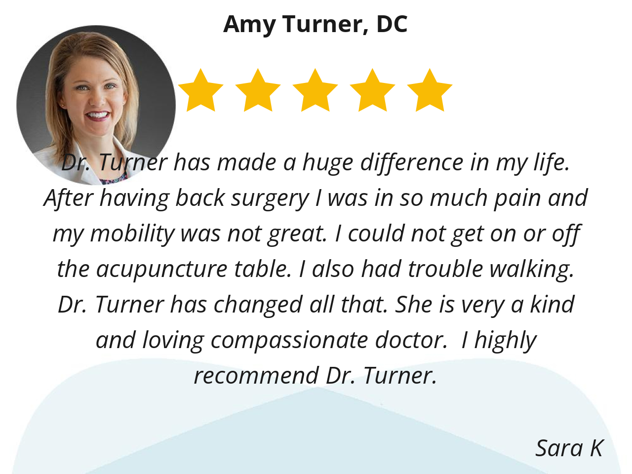 Dr. Turner has made a huge difference in my life. After having back surgery I was in so much pain and my mobility was not great. I could not get on or off the acupuncture table. I also had trouble walking. Dr. Turner has changed all that. She is very a kind and loving compassionate doctor. I highly recommend Dr. Turner.