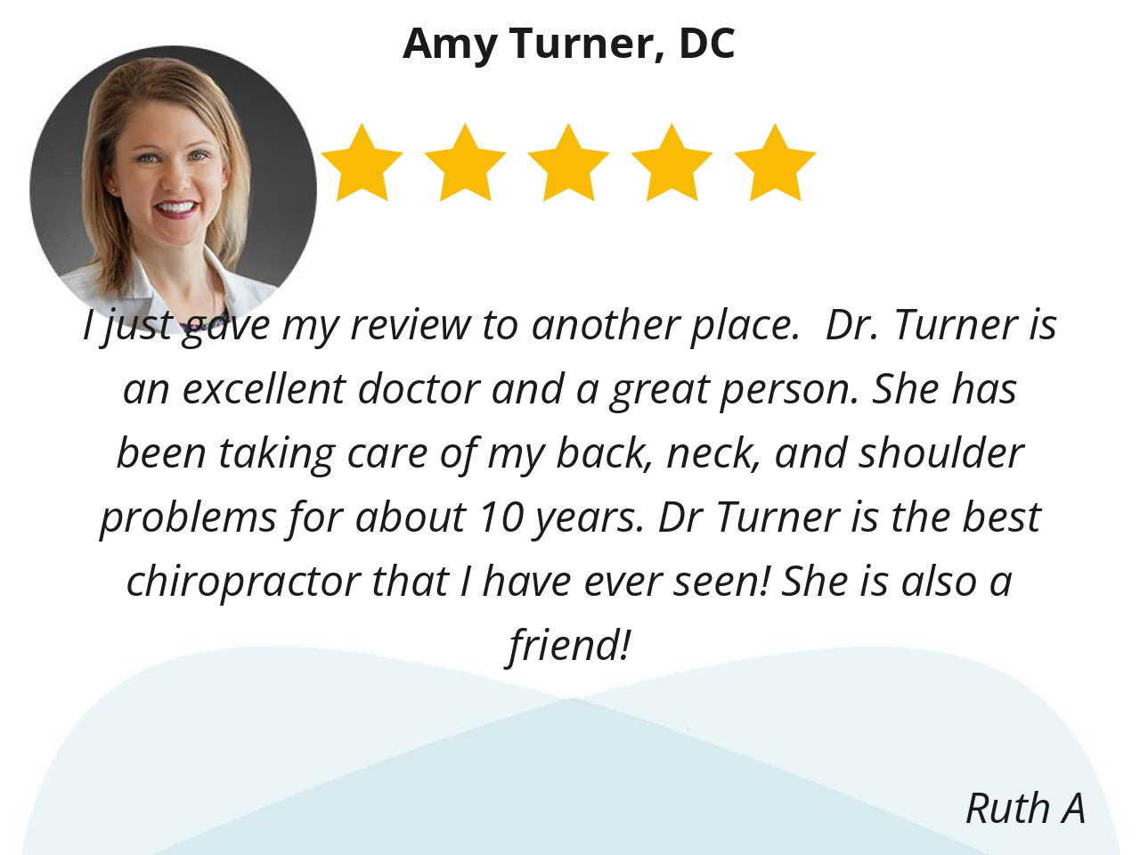 I just gave my review to another place. Dr. Turner is an excellent doctor and a great person. She has been taking care of my back, neck, and shoulder problems for about 10 years. Dr Turner is the best chiropractor that I have ever seen! She is also a friend!