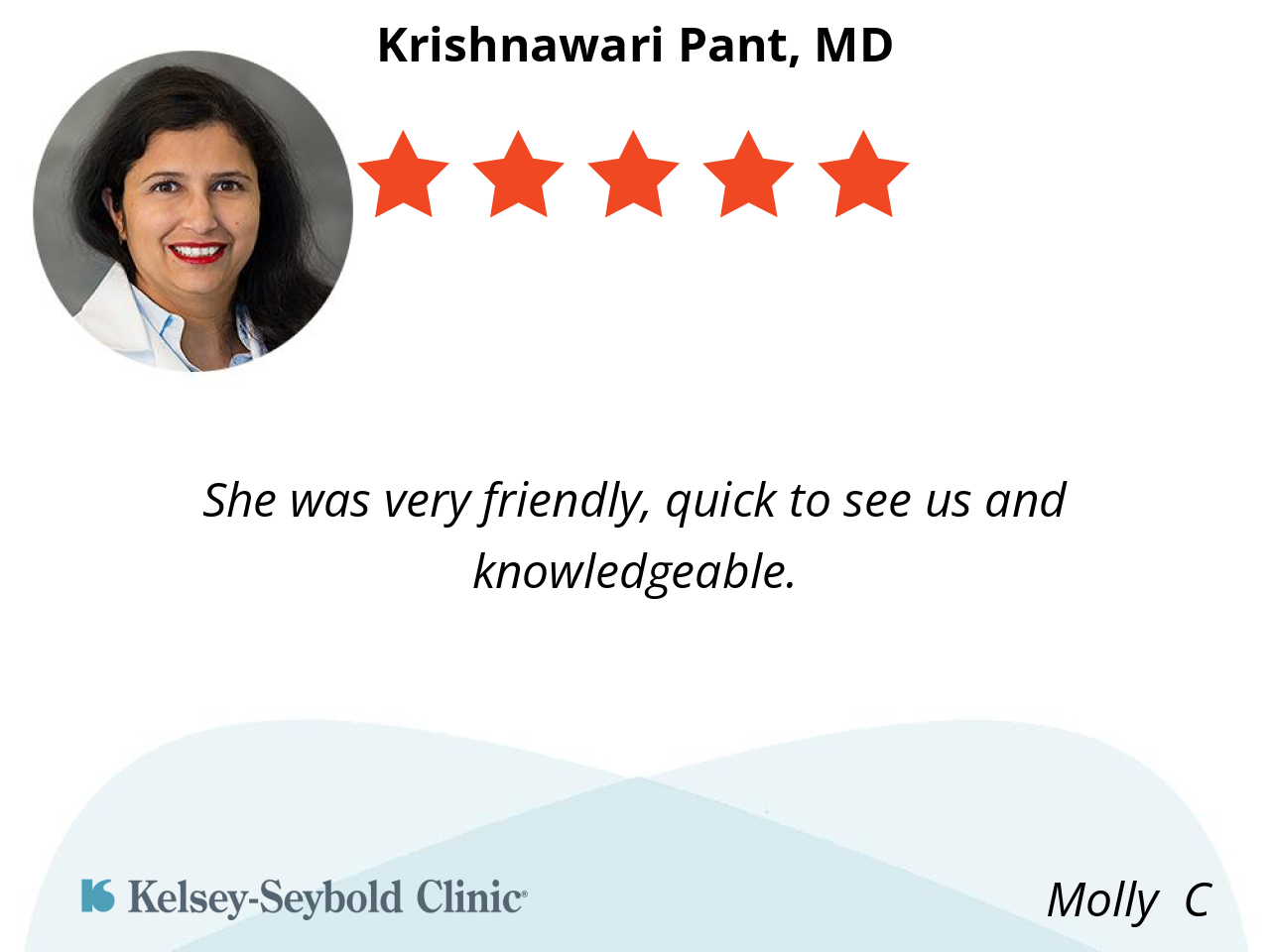 I would like to provide feedback on our recent visit. Our doctor was truly wonderful. She explained my daughter's condition with incredible clarity, which was very reassuring and put my mind at ease. She was also consistently kind and warm. I will absolutely be recommending her to my friends and family.