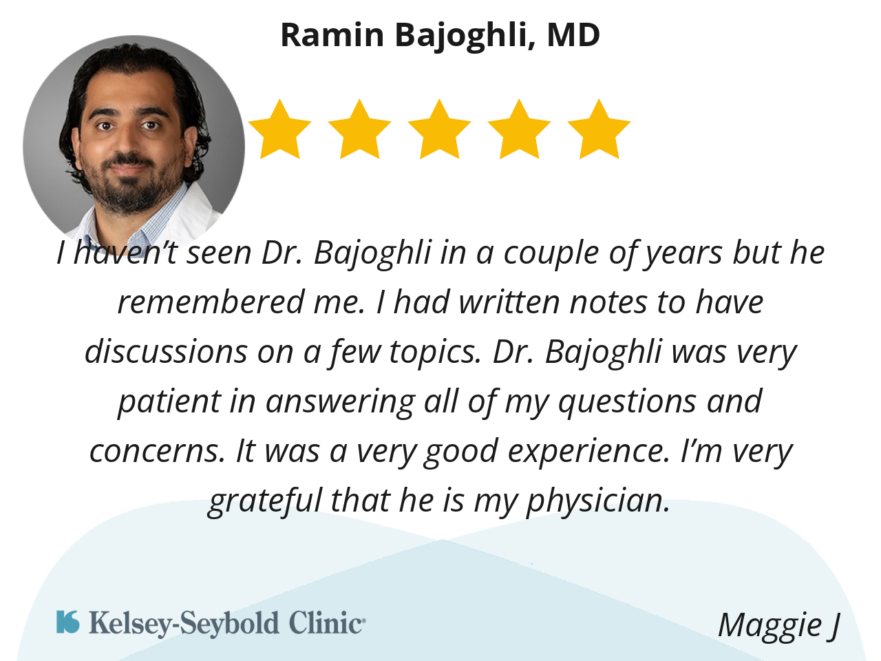 I haven’t seen Dr. Bajoghli in a couple of years but he remembered me. I had written notes to have discussions on a few topics. Dr. Bajoghli was very patient in answering all of my questions and concerns. It was a very good experience. I’m very grateful that he is my physician.