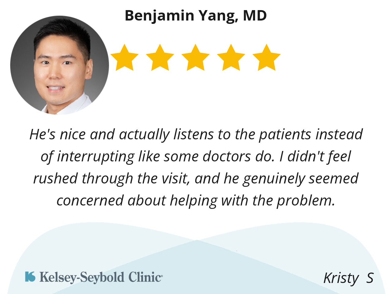 Dr. Ben Yang...Was a great communicator. He listened and commented on my concerns and concerns. Gave me information, testing, results of same and was personable. I really liked him and will see him again.