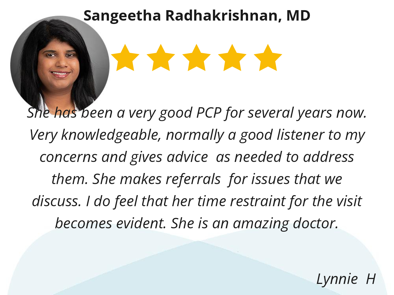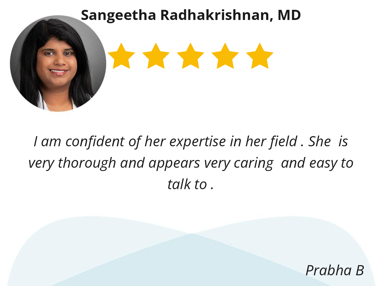 Dr. Rad is very personable and easy to talk to. She is also very thorough in her assessment of my health concerns. I trust and respect her medical expertise and I know she is genuinely concerned about my health and any health issues I have.