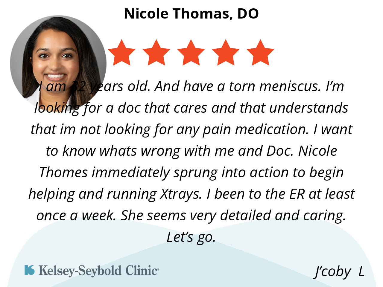 I am 32 years old. And have a torn meniscus. I’m looking for a doc that cares and that understands that im not looking for any pain medication. I want to know whats wrong with me and Doc. Nicole Thomes immediately sprung into action to begin helping and running Xtrays. I been to the ER at least once a week. She seems very detailed and caring. Let’s go.