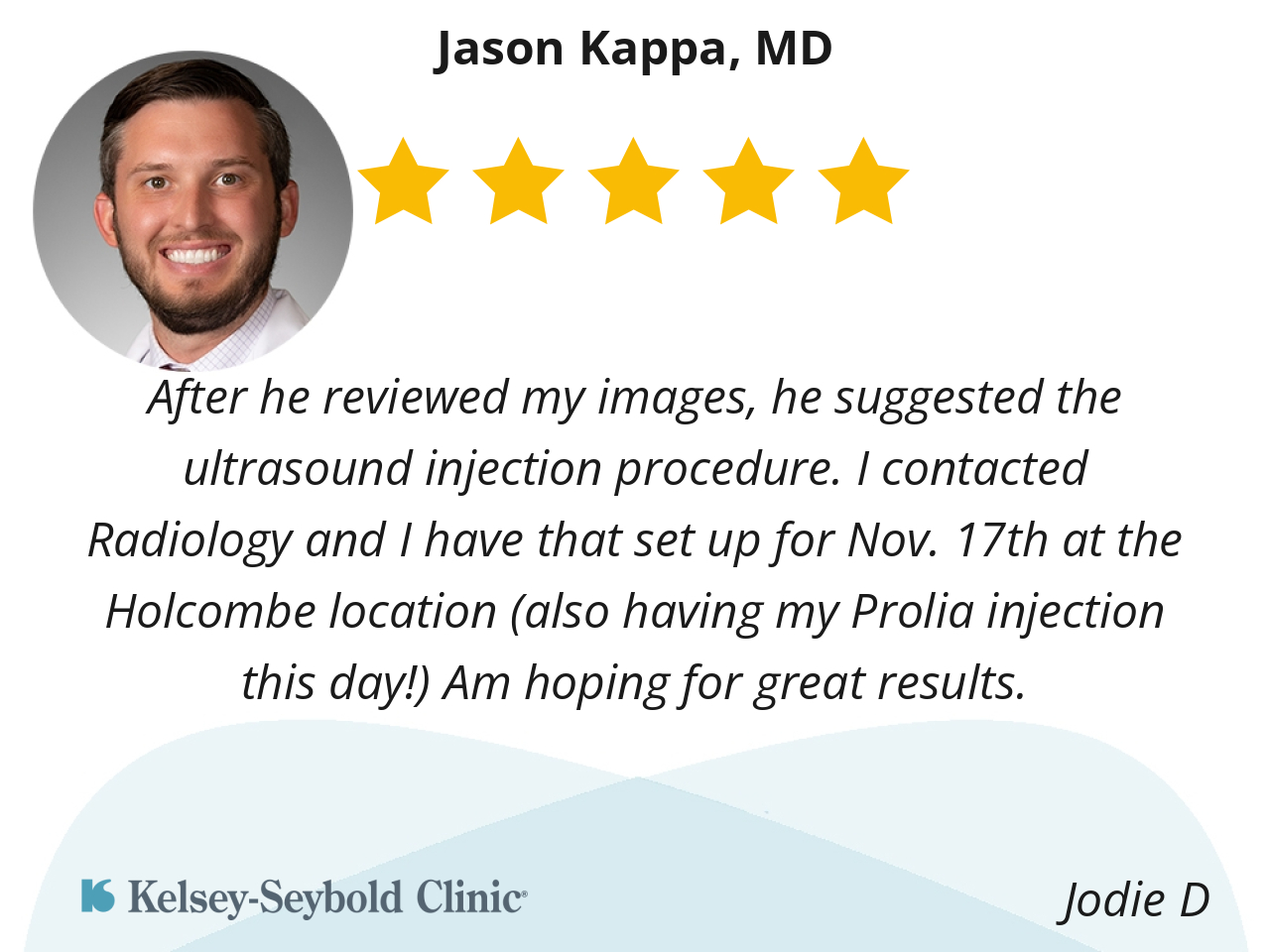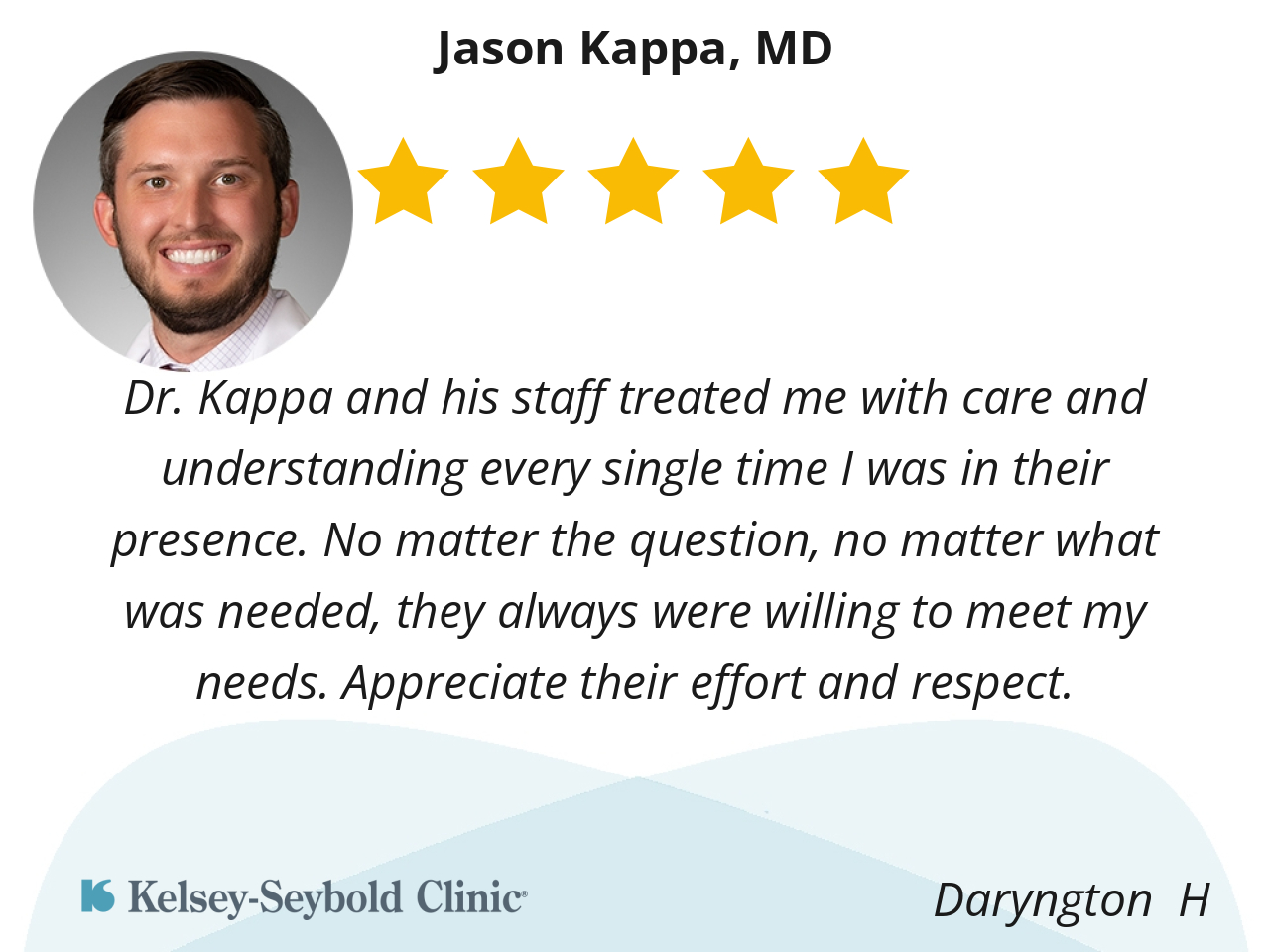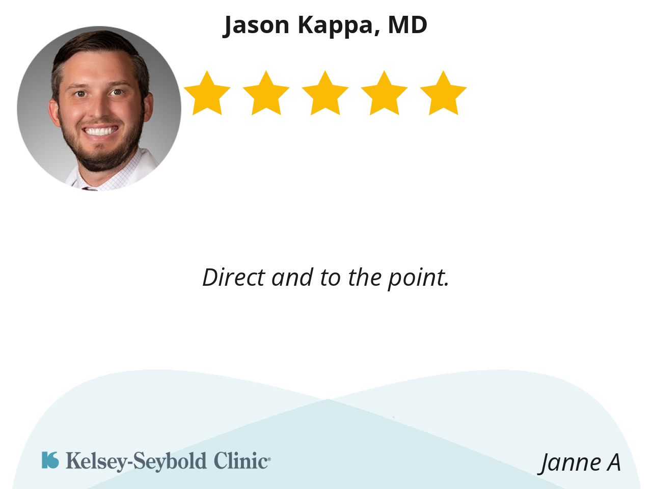 Dr. Kappa was very informative of the my injury and what procedure I was going to need. I like how he listen to all my concerns and answered my questions. I would recommend him 10/10
