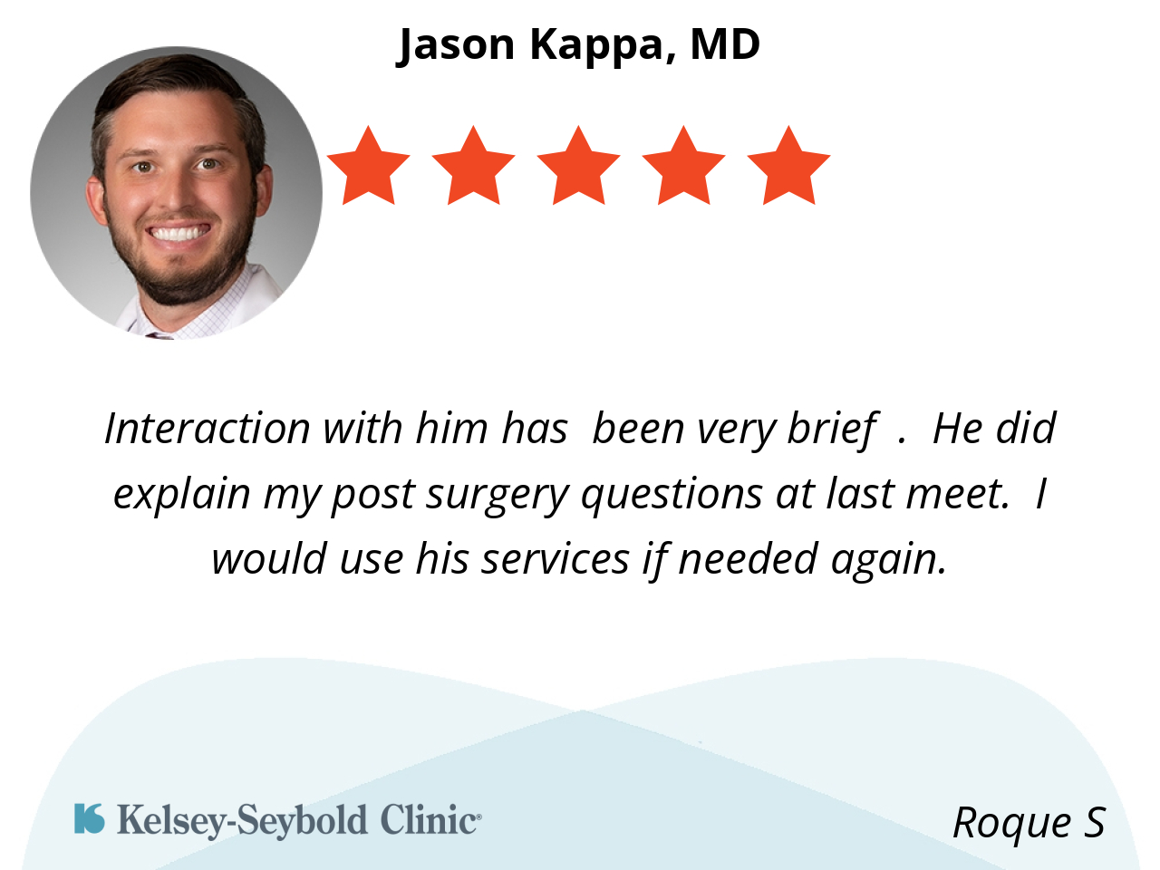 I have been seeing Dr. Kappa for my left shoulder for a little over a year now. I have been impressed with his candid advice as well as his thoroughness and patience in assessing my situation.