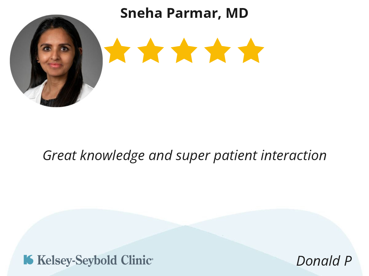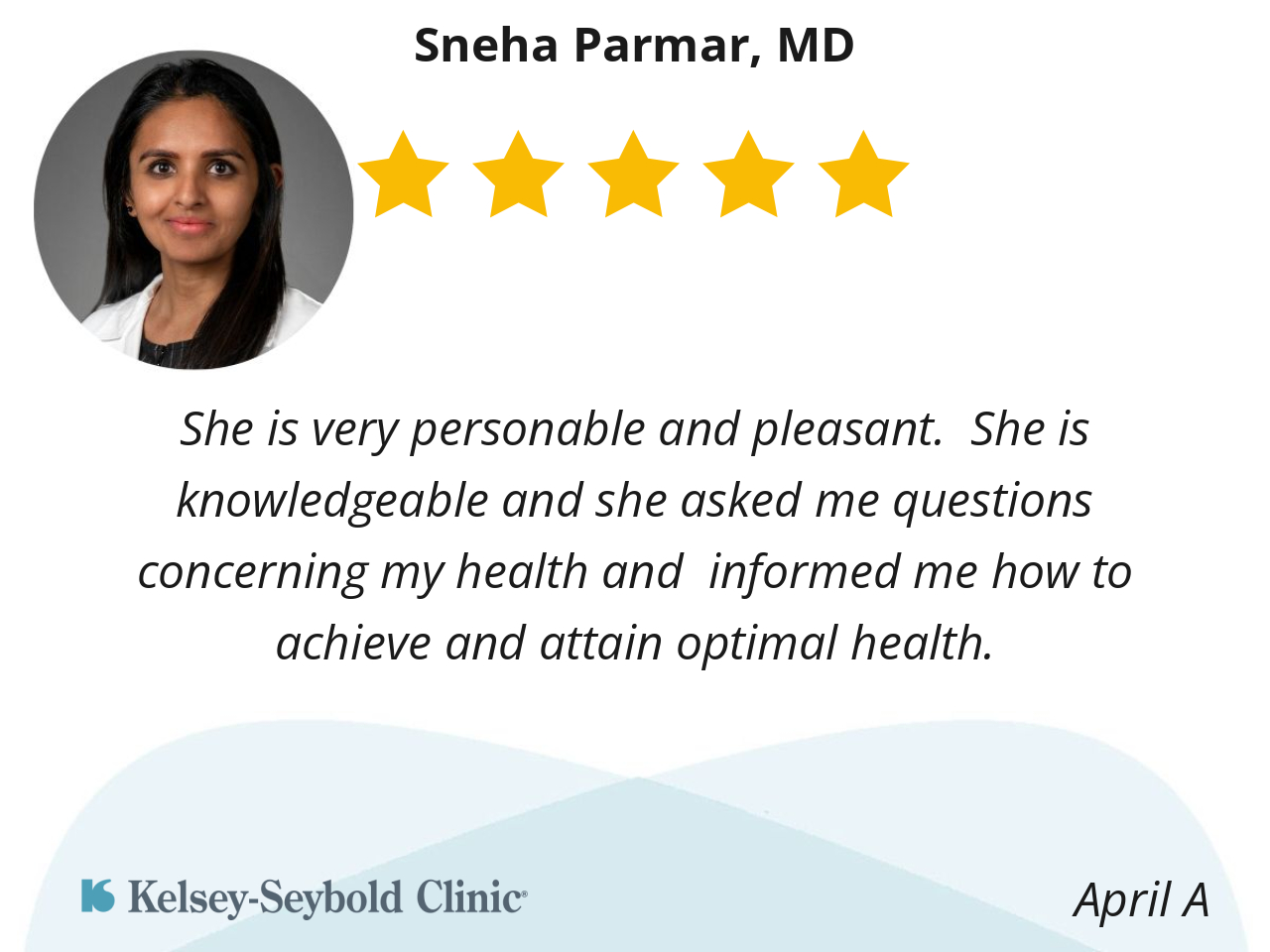 This was my second visit with Dr. Parmar and have found her to be what I would expect from my doctor. She listened to my questions and concerns and explained each and every one in a layman's language.