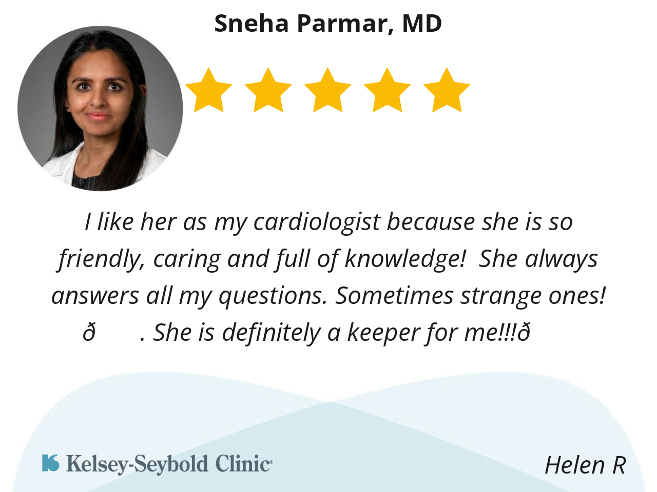 I like her as my cardiologist because she is so friendly, caring and full of knowledge! She always answers all my questions. Sometimes strange ones! 😉. She is definitely a keeper for me!!!💕