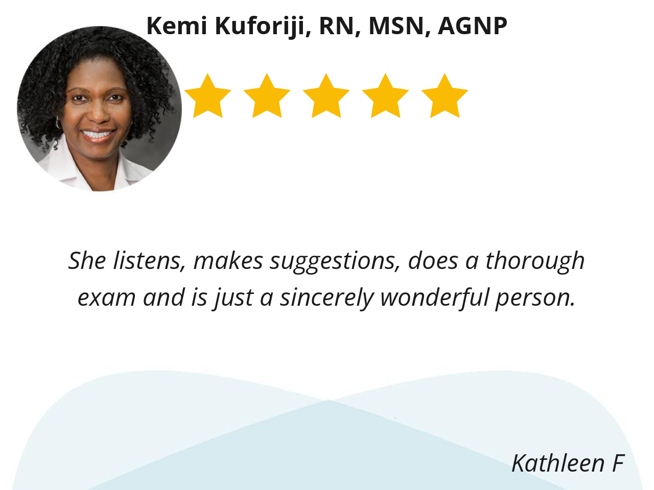 I like Kemi because she is thorough, personable, and willing to listen to my concerns and questions. She is always pleasant I feel that I can talk with her about any concerns I may have.