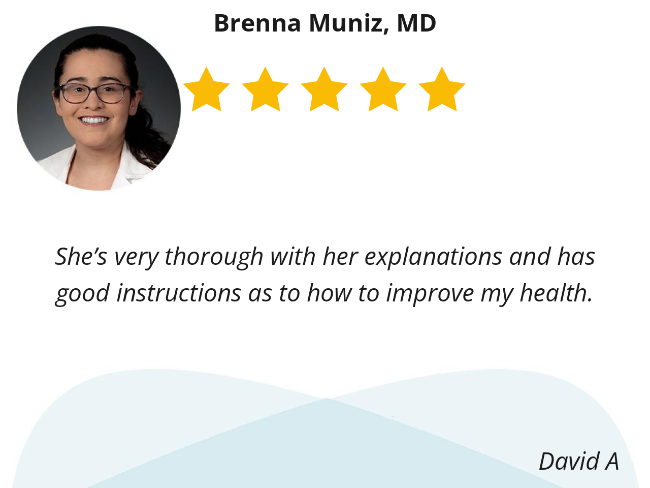 I like Dr Brenna Muniz because she is kind, an ardent listener, and keeps a good eye on my physical healthy wellbeing. She’s exemplary.