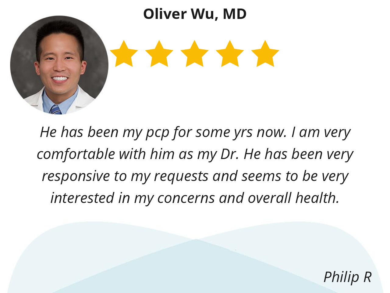 Dr. Wu is incredibly professional and kind. He always takes the time to speak with me and truly listens, I never feel rushed, even though I know his schedule is busy. It's clear that he genuinely cares about his patients. His knowledge and expertise are reassuring, and he consistently makes me feel comfortable and respected during every visit.