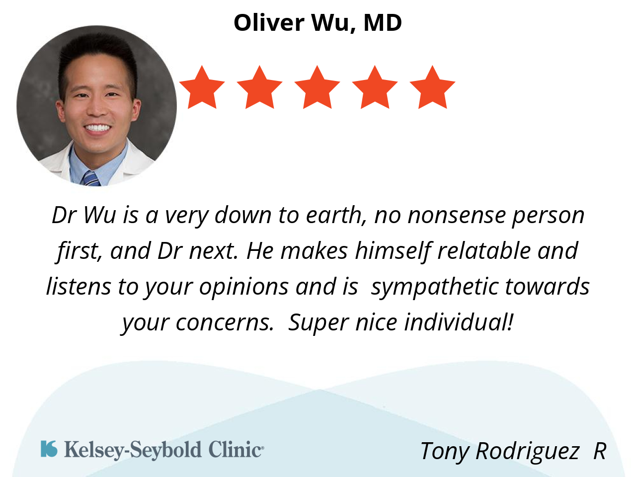 Dr Wu is a very down to earth, no nonsense person first, and Dr next. He makes himself relatable and listens to your opinions and is sympathetic towards your concerns. Super nice individual!