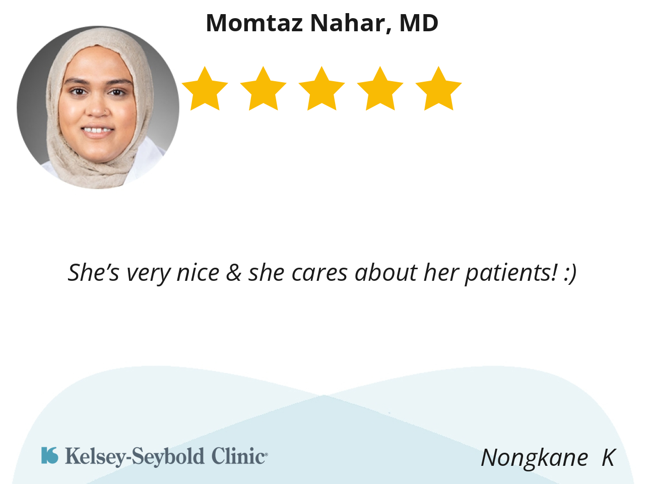DR Nahar makes me fell very comfortably and at ease, easy to talk and very detailed oriented in her exams.