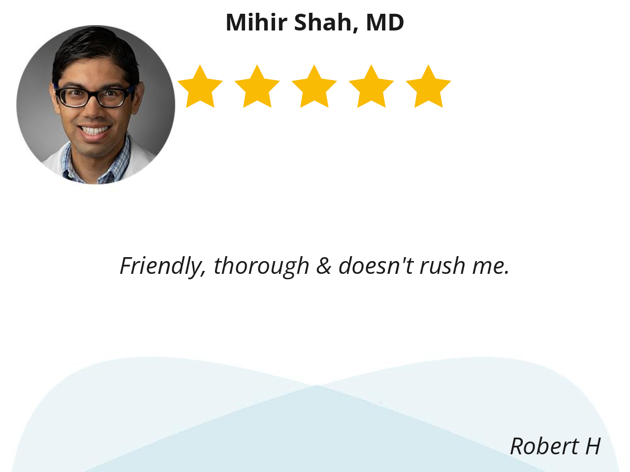 Dr Shah is patient, caring, listens. I am a senior citizen who has a number of health problems and someone who says her mind. He never gets upset. Answers any questions Still tells me why it is good idea to change eating habits although I tell I eat donuts with my coffee and I feel better around 150 pounds instead of 120. His bedside manner is Superb. His voice tone is great. I tell all my other Specialists how great he is