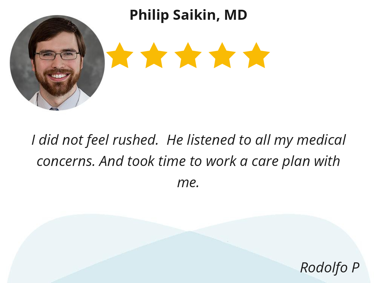 Dr. Philip Saikin has been my Primary Care Physician for several years now and he’s an Awesome doctor! He’s very compassionate, professional, caring, concerned and very knowledgeable. He takes time to discuss and addresses all my concerns and health issues with detailed information. I truly appreciate him assisting me and I’m Blessed to have him as my doctor. Thanks Dr. Saikin for all you doing to help me get back to a normal lifestyle. He always provides me with excellent service and solutions to my concerns. “Yes, I “highly recommend”Dr. Saikin to others! His Nurses are AWESOME, friendly, professional, nice, compassionate and very caring