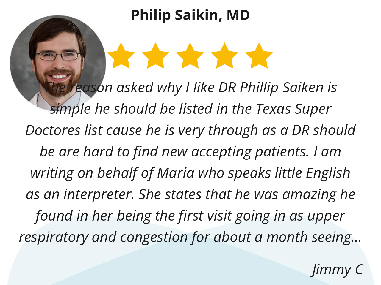 The reason asked why I like DR Phillip Saiken is simple he should be listed in the Texas Super Doctores list cause he is very through as a DR should be are hard to find new accepting patients. I am writing on behalf of Maria who speaks little English as an interpreter. She states that he was amazing he found in her being the first visit going in as upper respiratory and congestion for about a month seeing already Two new MD Doctors with Kelsey and an urgent carenow PA has been given several antibiotics she has a Innocent Heart Murmur “We did not know and had never told that” Dr. Phillip doing his above and beyond the norm not just a name on paper nor fitting a glove some Doctors do BUT listening and asking the right questions to help the patient. She doing an about face in recovery in less than 24 hours. Thank you Dr Phillip Sakien. You have went in 1 visit made a happy patient be free to recover from that sickness in doing so repairing her GUT to normal after all that Antibiotics. Looking to have you as our PCP in the family especially after our 18 year with our retired PCP in late November because an experience Dr I hard to find to fill the shoes in replacing him. I feel we have found an excellent replacement for our new PCP. Hope the DR Phillip Saiken keeps up his good work.
