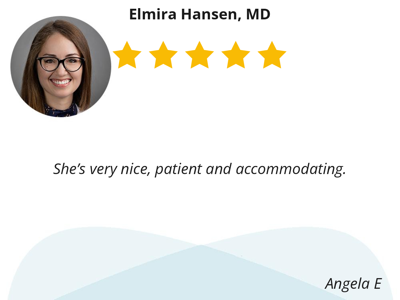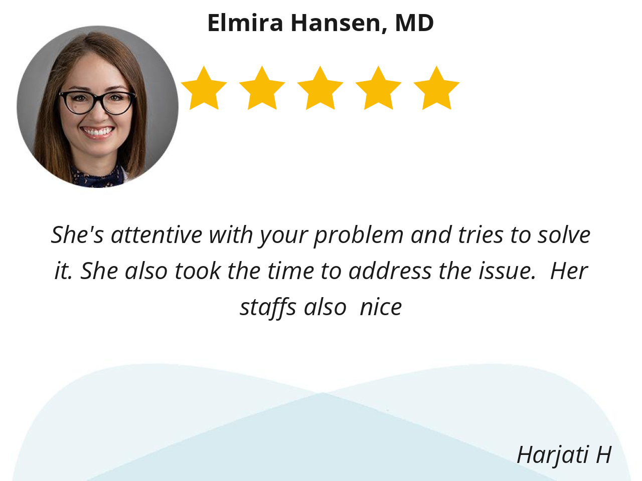 Dr. Elmira Hansen always greets me with her sweet smile. Even with negative results of my blood works, she is positive, telling me it is not that bad, since my age is 81, which make me feel lucky and blessed,