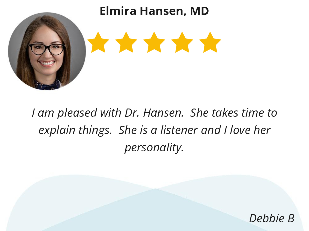 I am pleased with Dr. Hansen. She takes time to explain things. She is a listener and I love her personality.