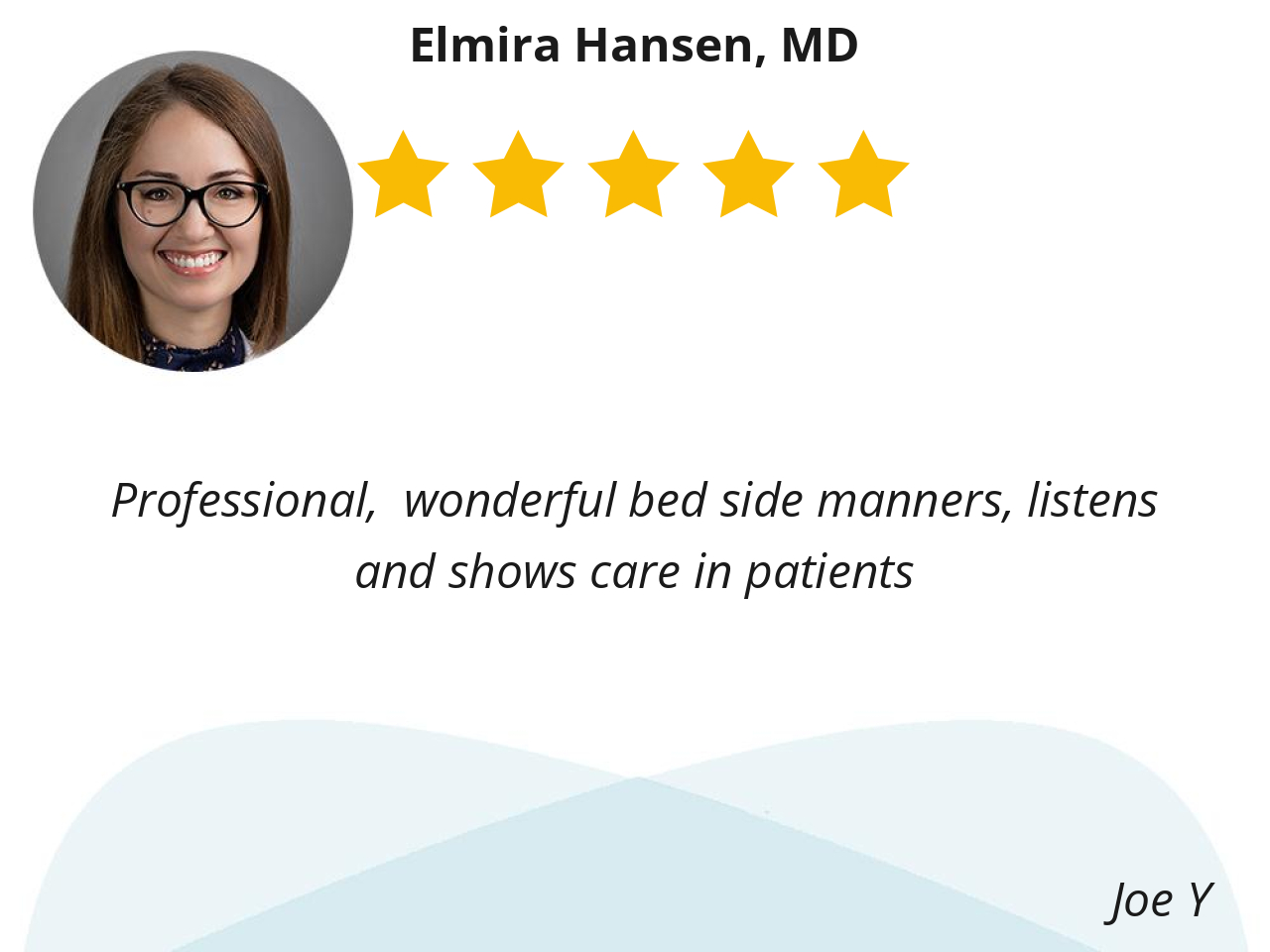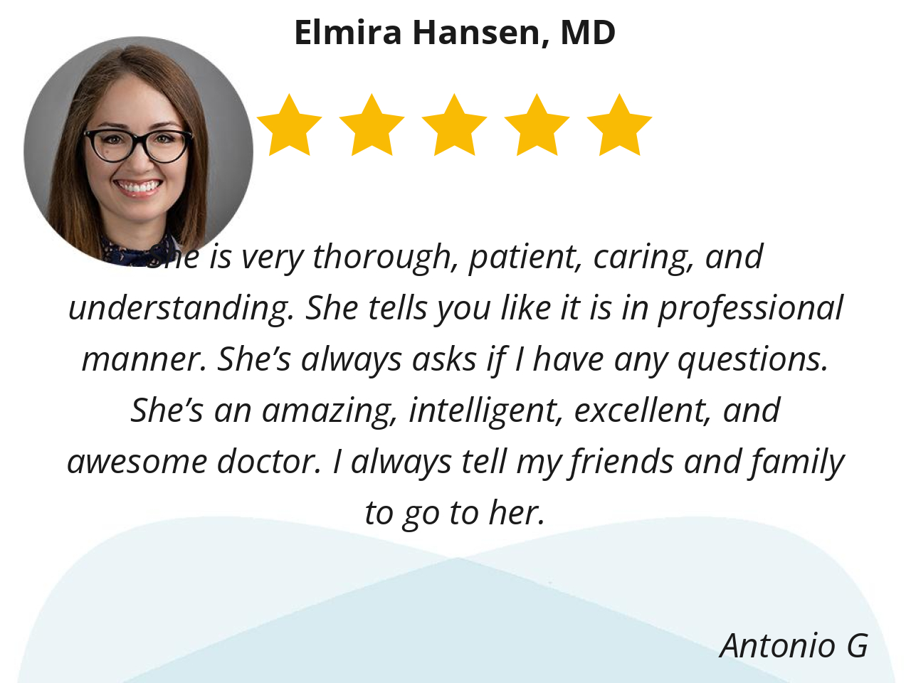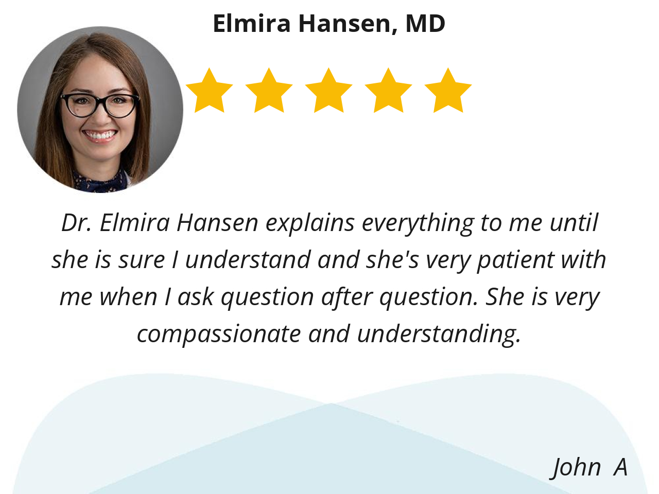 Dr. Elmira Hansen explains everything to me until she is sure I understand and she's very patient with me when I ask question after question. She is very compassionate and understanding.