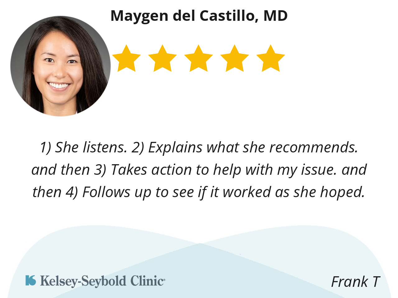 Dr. Maygen del Castillo is a sweet, gentle, and understanding cardiology that managing both my daughter and my cardio risk. We rely on and trust her step-by-step process in treatment and discovery.