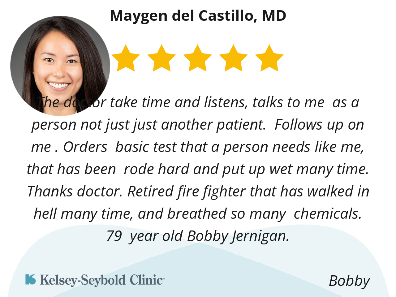 The doctor take time and listens, talks to me as a person not just just another patient. Follows up on me . Orders basic test that a person needs like me, that has been rode hard and put up wet many time. Thanks doctor. Retired fire fighter that has walked in hell many time, and breathed so many chemicals. 79 year old Bobby Jernigan.