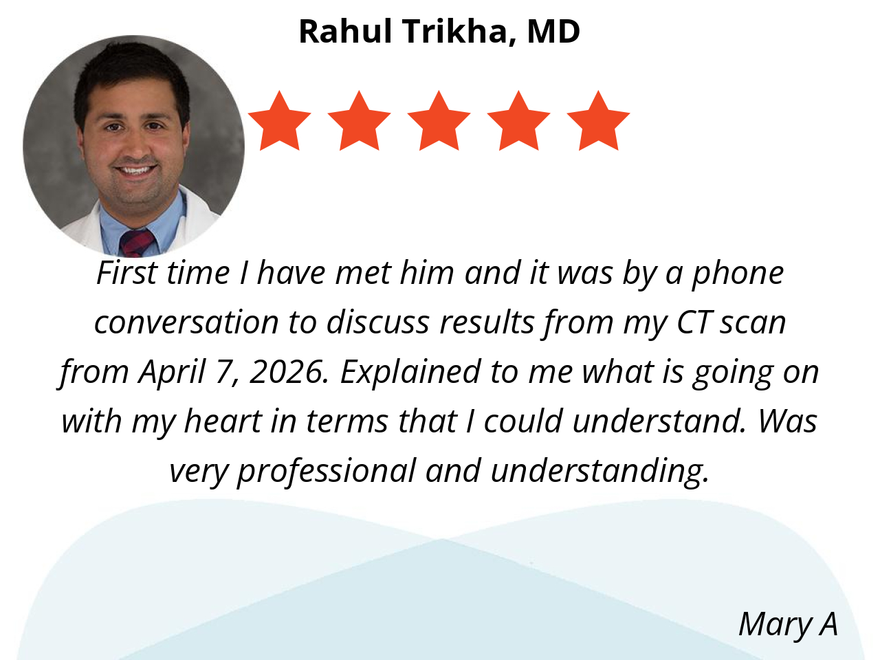 First time I have met him and it was by a phone conversation to discuss results from my CT scan from April 7, 2026. Explained to me what is going on with my heart in terms that I could understand. Was very professional and understanding.