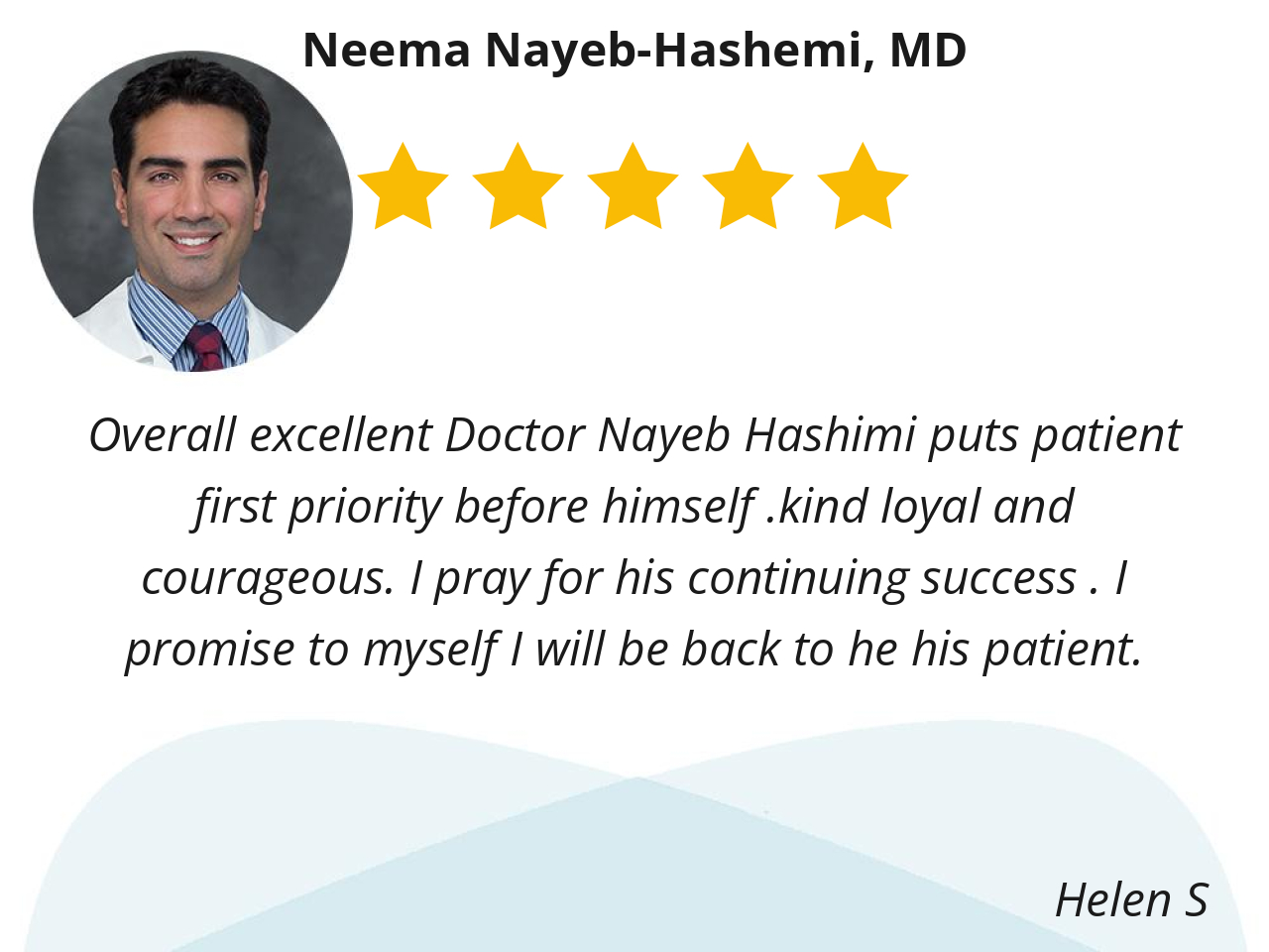 Overall excellent Doctor Nayeb Hashimi puts patient first priority before himself .kind loyal and courageous. I pray for his continuing success . I promise to myself I will be back to he his patient.