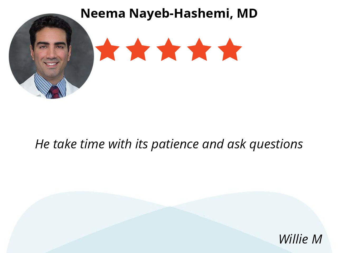 Dr Nayeb Hashemi all around excellent, he prioritized patients.To me putting patients first before anything else , I praise for him to what I encounter with my procedure and follow up appointments. I thank you Dr Hashemi for taking care of me with Opthamologist Vision Department.