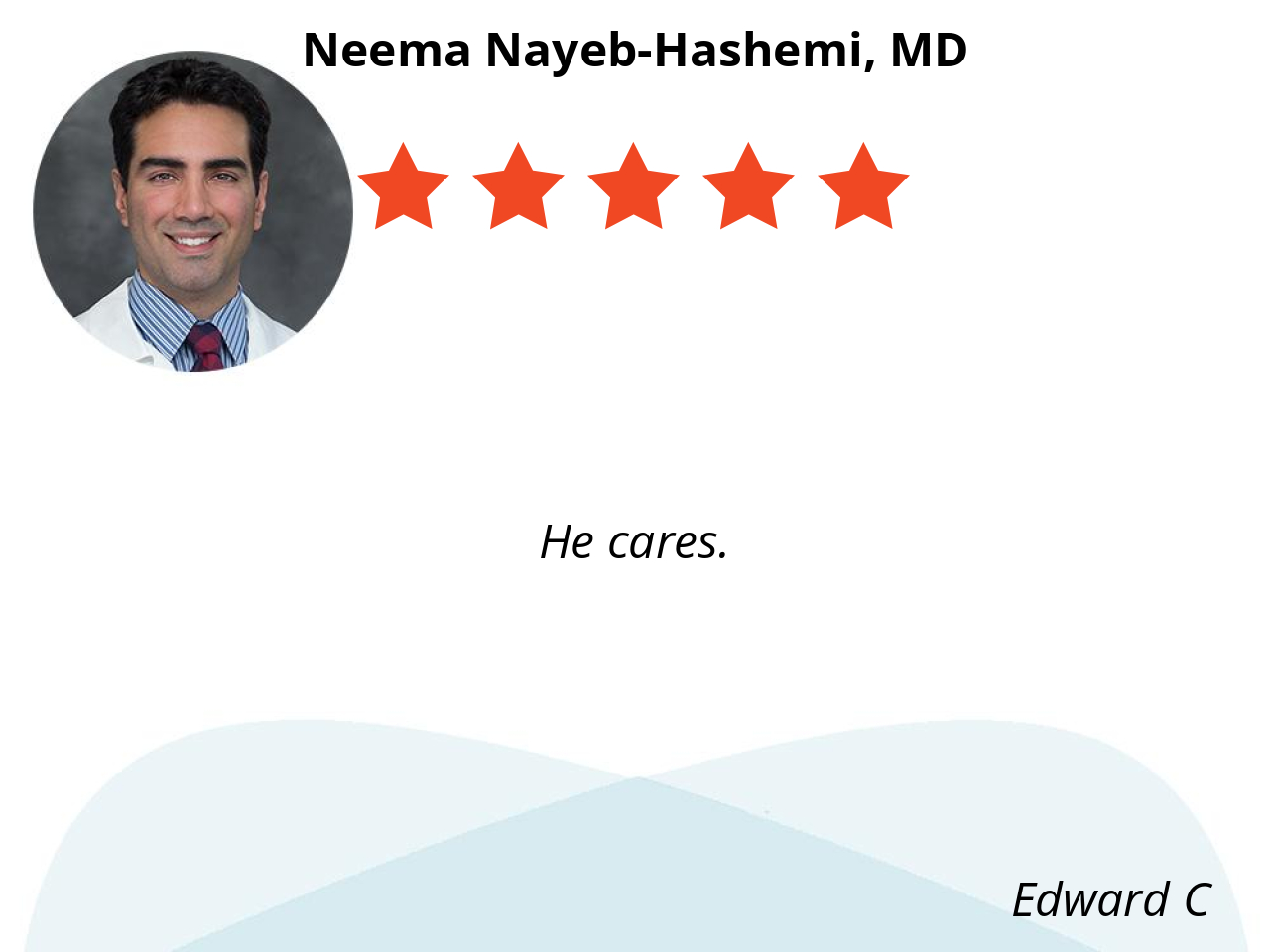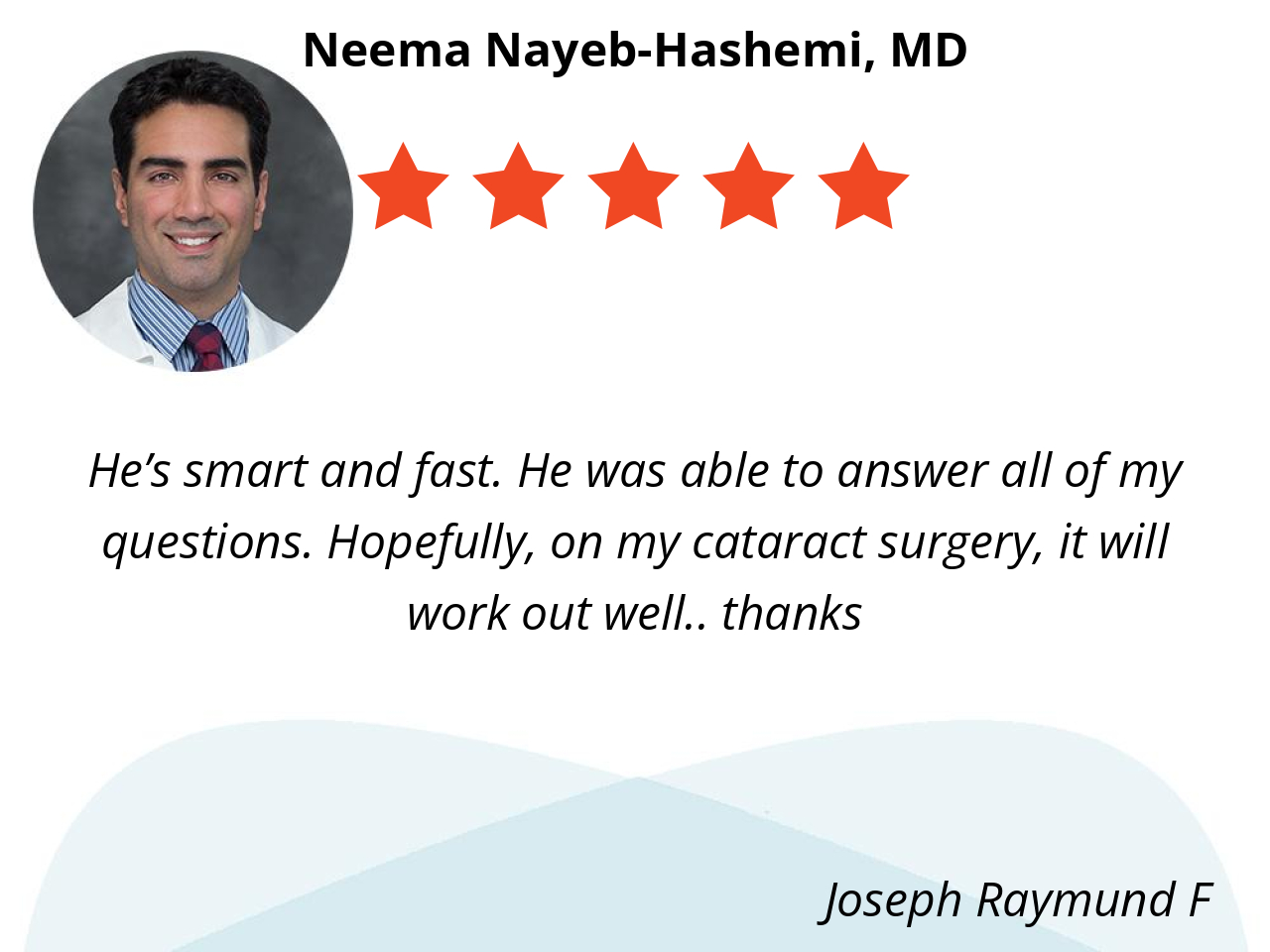 Dr Neema Nayeb-Hashemi Opthamologist-You’re a great listener and explained things so clearly . Thank you for your patience and for making me feel confident in my care!