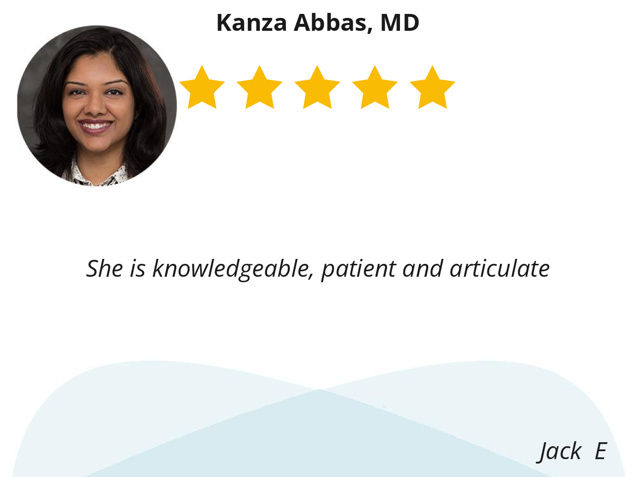 Kanza Abbas M.D. is my most favorite doctor. She is so great at what she does. Her manner and disposition is always pleasing and refreshing. She makes my day. She is such a great person to have for my health concerns. I feel the freedom to be open and at ease as well as the highest confidence and completion after our visit has expired. Kanza Abbas M.D. is truly a extraordinary and outstanding professional.