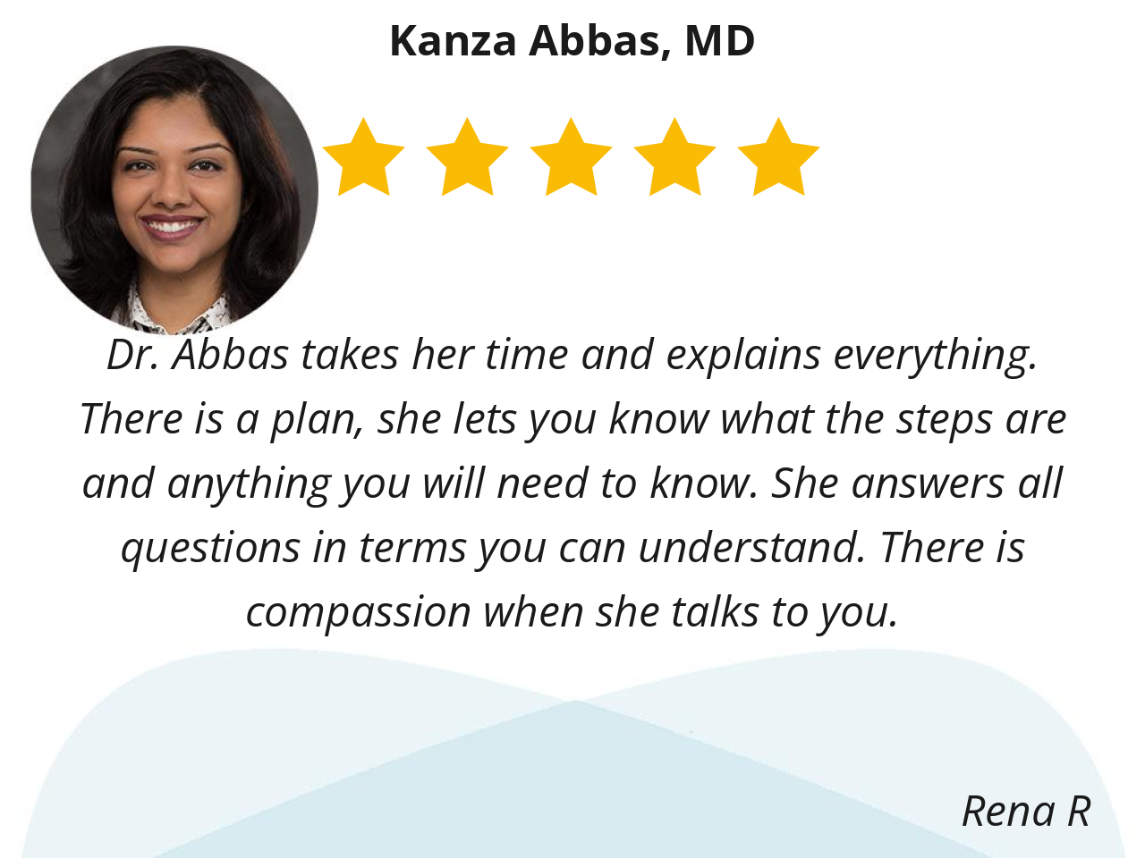 Dr. Abbas takes her time and explains everything. There is a plan, she lets you know what the steps are and anything you will need to know. She answers all questions in terms you can understand. There is compassion when she talks to you.
