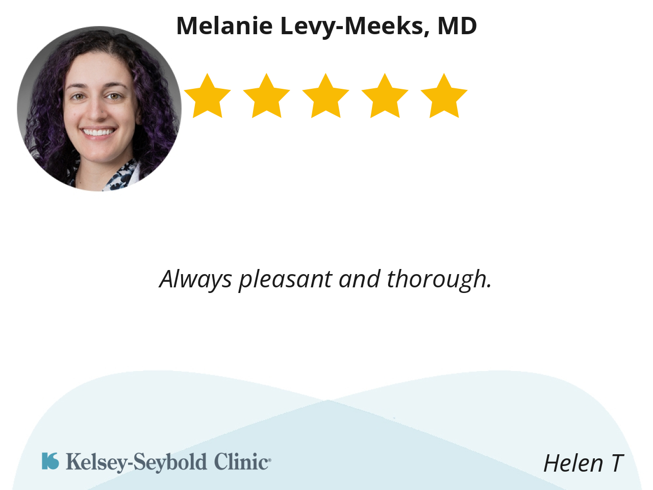 Dr. Levy-Meeks is one of the best physicians I've ever had. Her bedside manner is top notch. She is extremely knowledgeable and takes the time to truly listen to and care for her patients. I am so grateful to have her as part of my care team at Kelsey-Seybold.