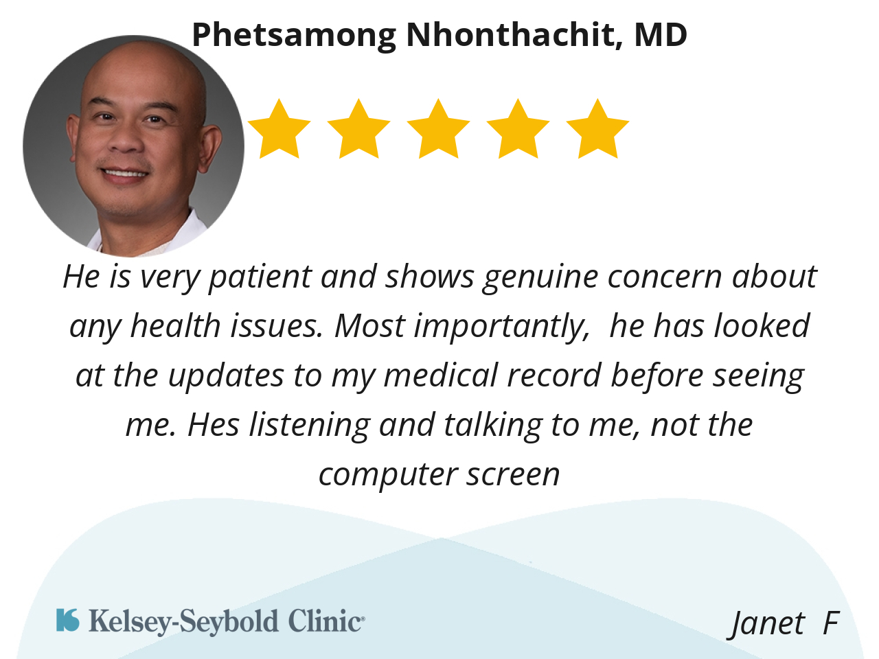He is very patient and shows genuine concern about any health issues. Most importantly, he has looked at the updates to my medical record before seeing me. Hes listening and talking to me, not the computer screen