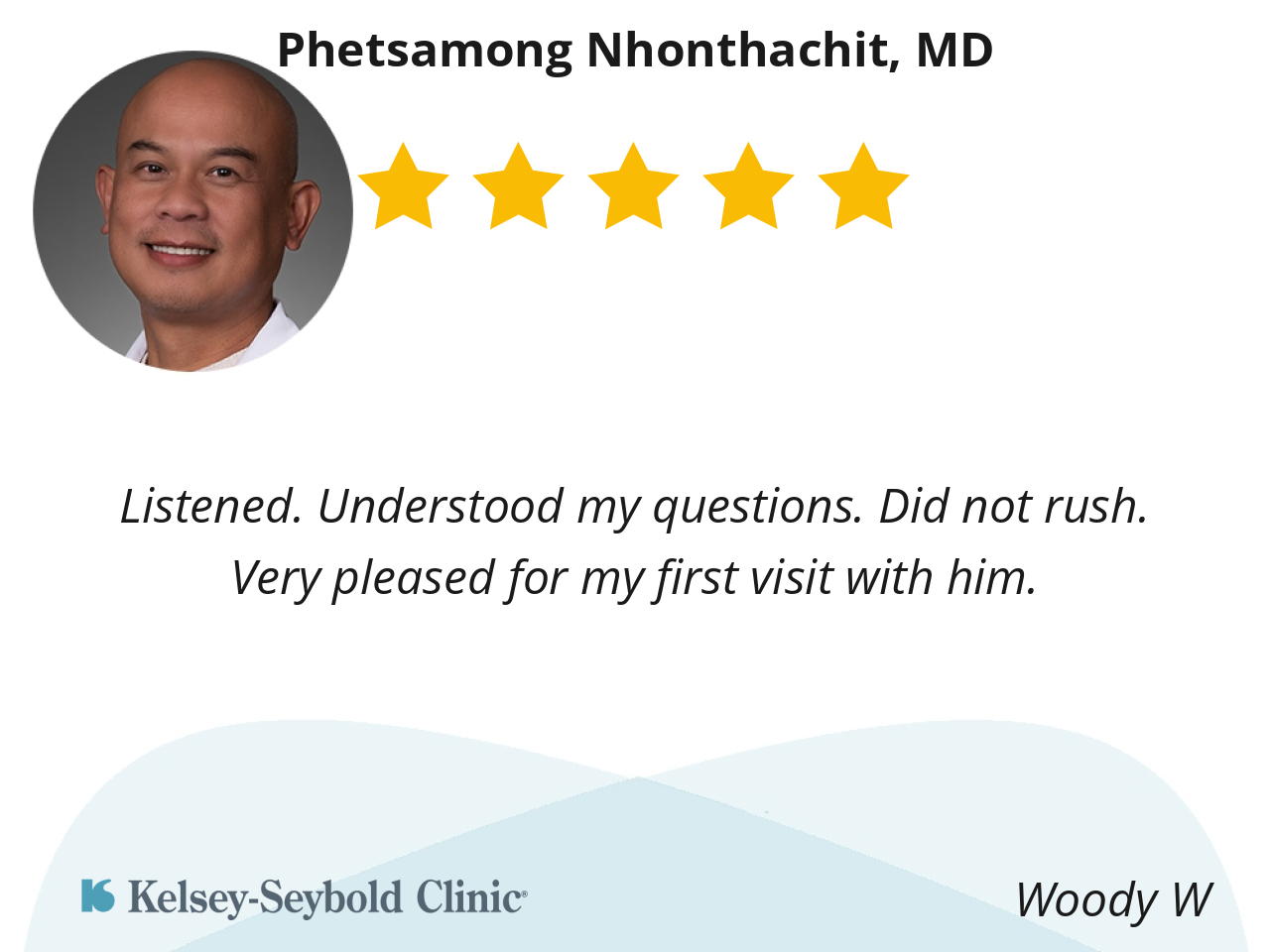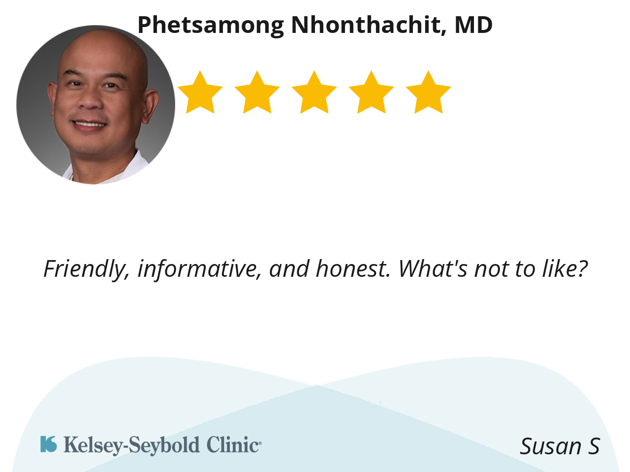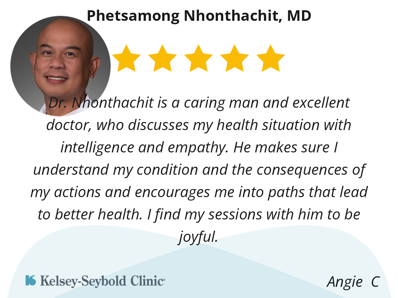 I like Dr. Nhonthachit because every time I have a visit with him he takes the time to hear out my problems, he explains everything in detail, he’s very personable, knowledgeable and he makes you feel like he really cares about your health.