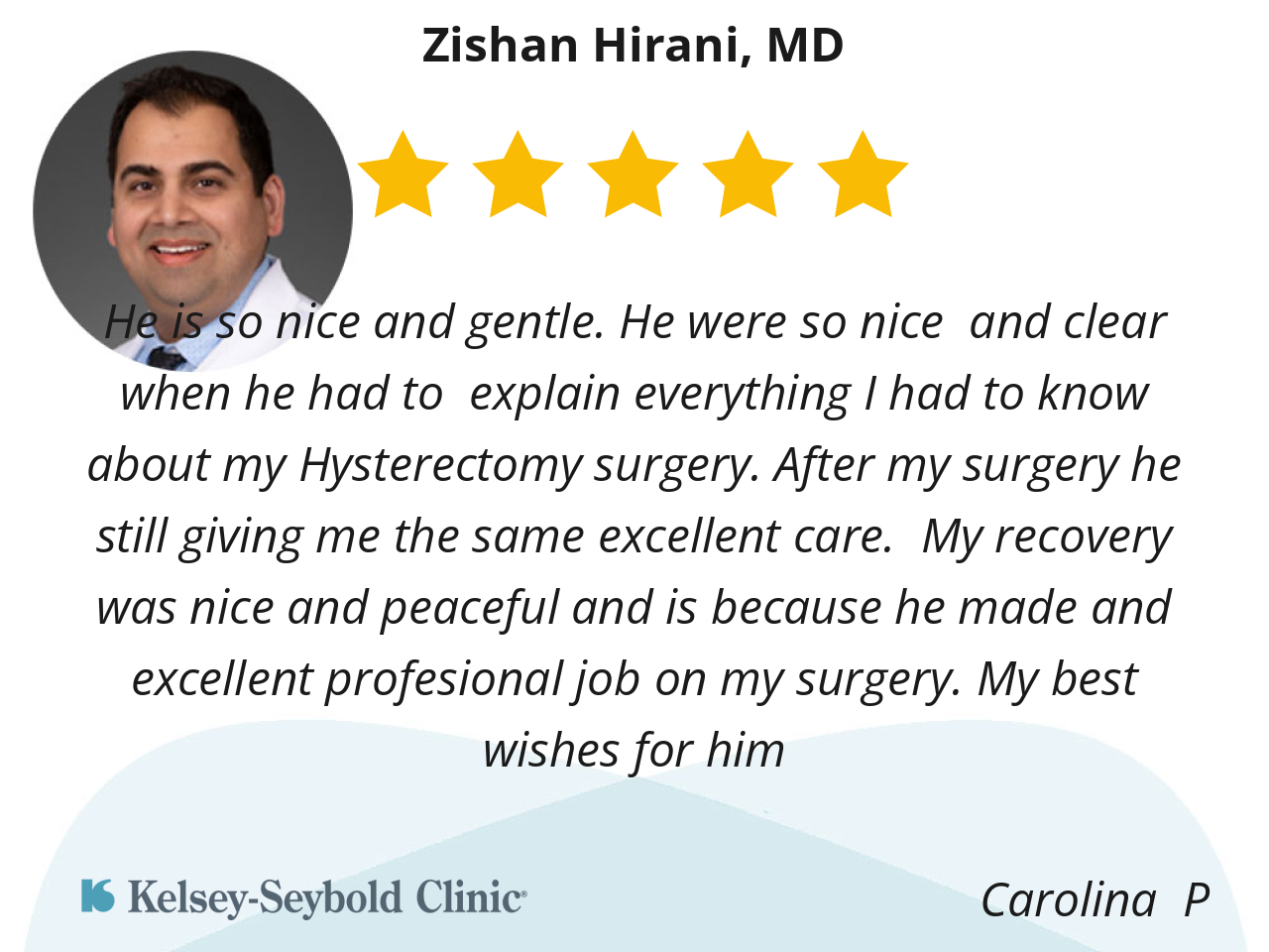 He is so nice and gentle. He were so nice and clear when he had to explain everything I had to know about my Hysterectomy surgery. After my surgery he still giving me the same excellent care. My recovery was nice and peaceful and is because he made and excellent profesional job on my surgery. My best wishes for him