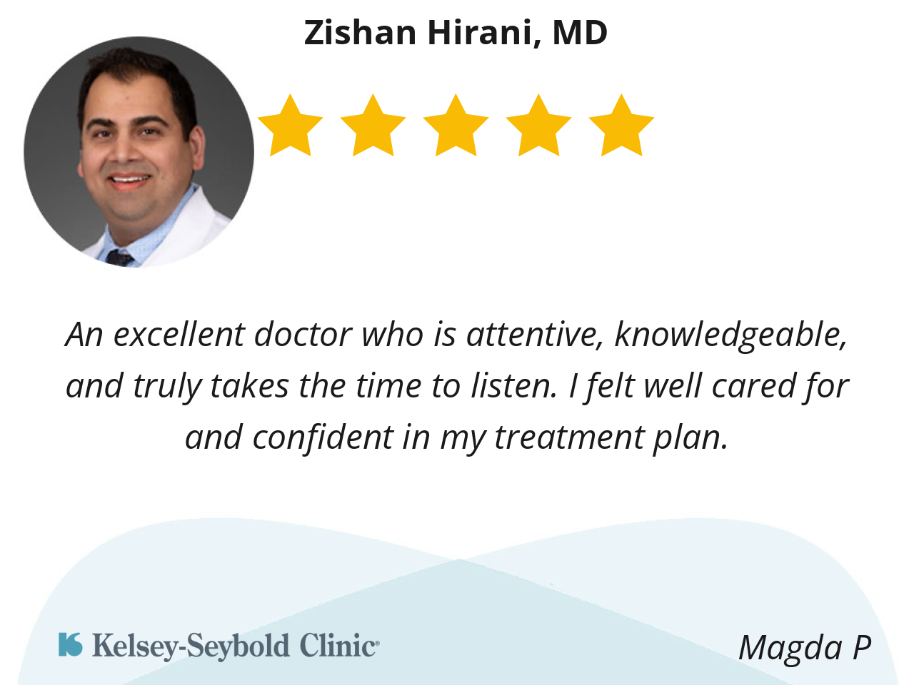 Dr. Hirani’s skills and expertise provides his patients with options that allows for hope and healing. He goes above and beyond to ensure his patients receive the best care. He is honest, caring, and to the point. Dr. Hirani’s many admirable qualities makes him a great clinician and leader.