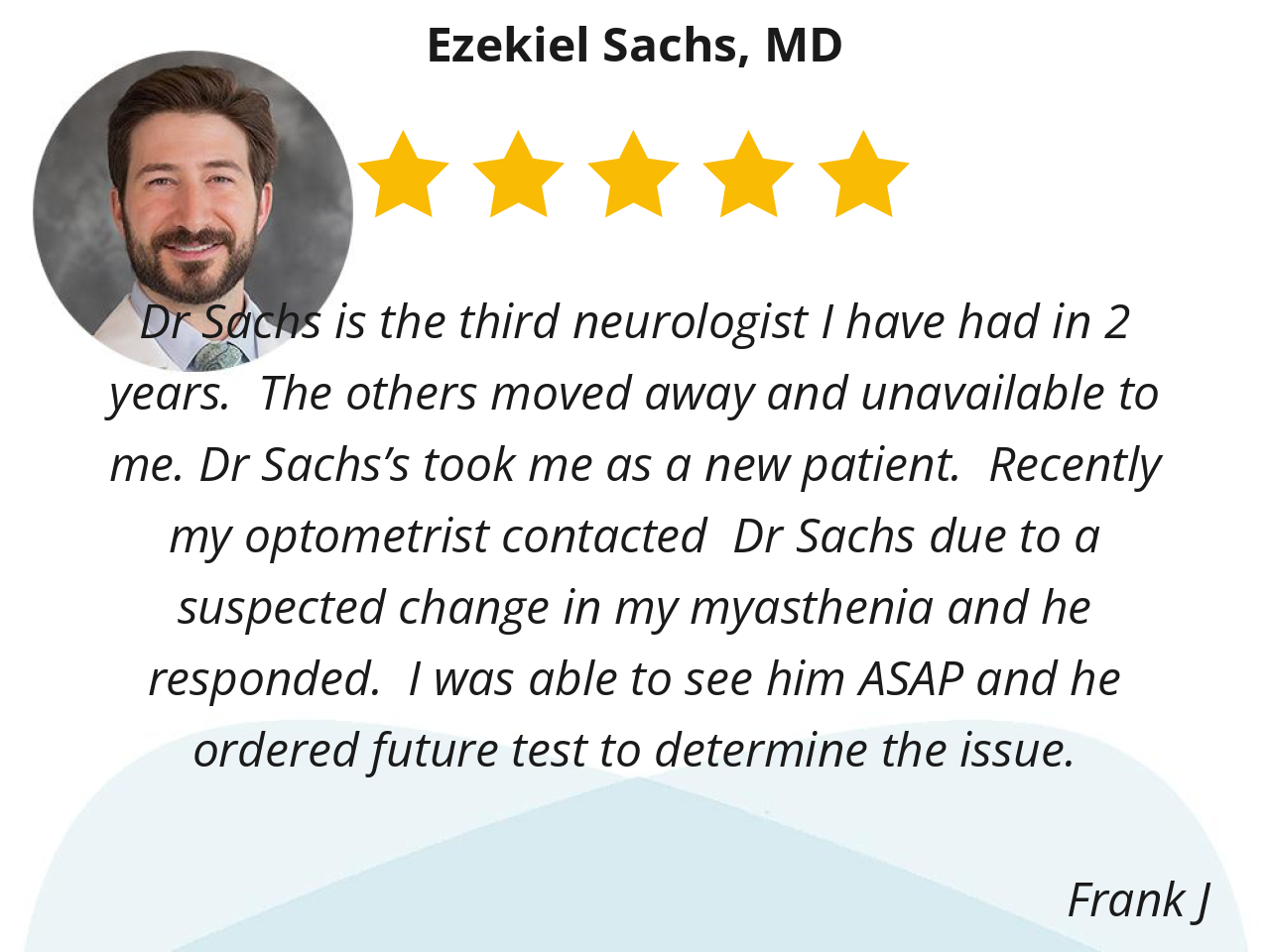 Dr Sachs is the third neurologist I have had in 2 years. The others moved away and unavailable to me. Dr Sachs’s took me as a new patient. Recently my optometrist contacted Dr Sachs due to a suspected change in my myasthenia and he responded. I was able to see him ASAP and he ordered future test to determine the issue.